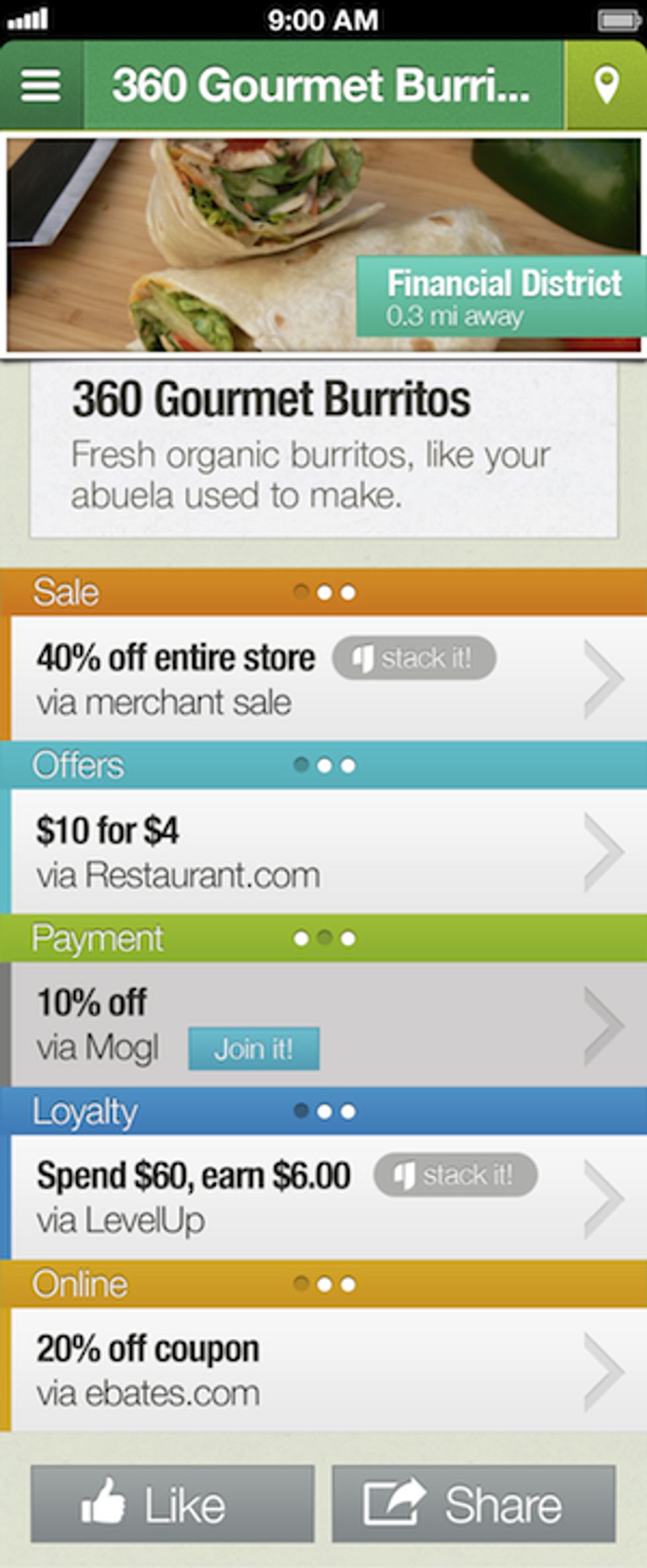 “Our app helps you make sense of the landscape of deals,” he says. "Then, when you walk into a merchant you can combine all of the deals at once.”