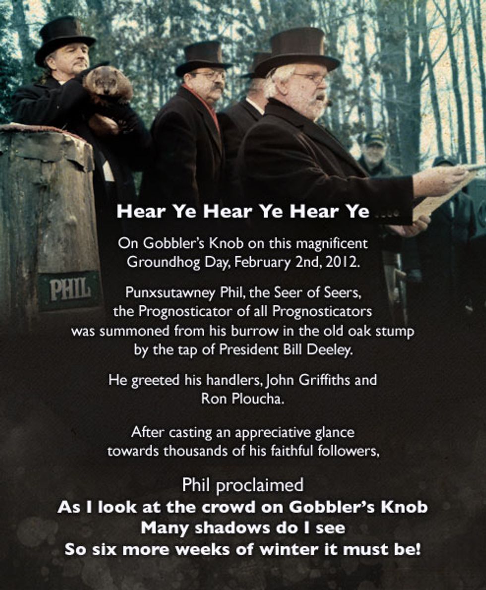 Happy Groundhog Day! This morning almost 18,000 people gathered at Gobbler's Knob in Pennsylvania to witness Punxsutawney Phil's annual prediction. And what exactly did he decide? This is what it says on his website: