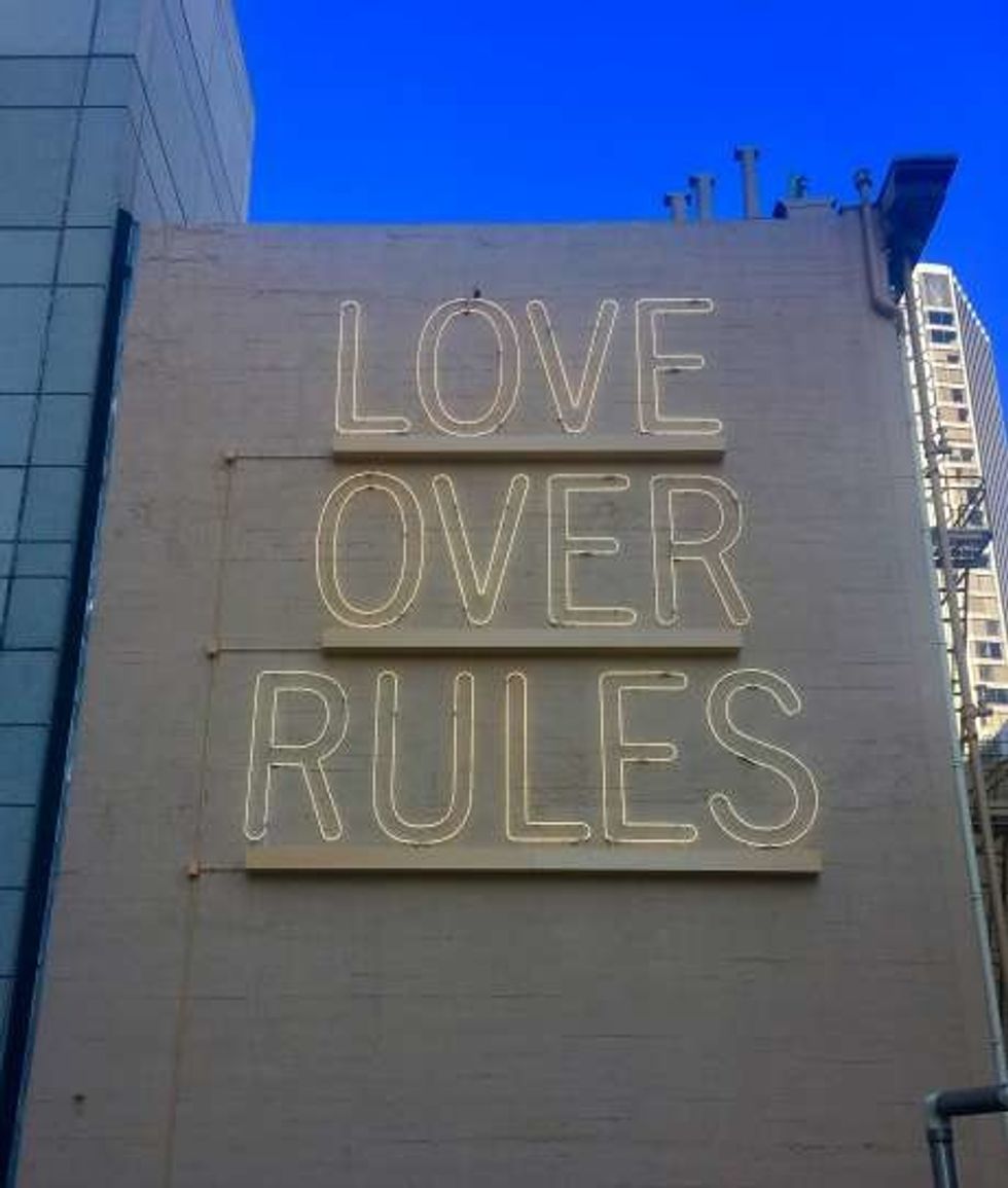 If you've strolled past SFMOMA lately and looked up, you've likely seen these three big little words "Love Over Rules."