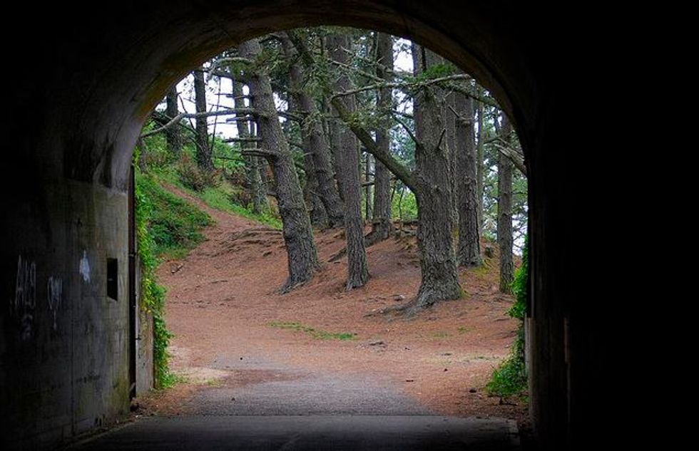 At the roundabout (3.6 miles) bear left and continue up. Once you’ve reached the summit take a breather and take a look around – the tunnels you see are part of two 16-inch gun emplacements placed here in WWII to toss 2,200-pound battleship shells 25 miles out into the Pacific should the Japanese Fleet ever appear. We’ll ride past the second further on this ride.