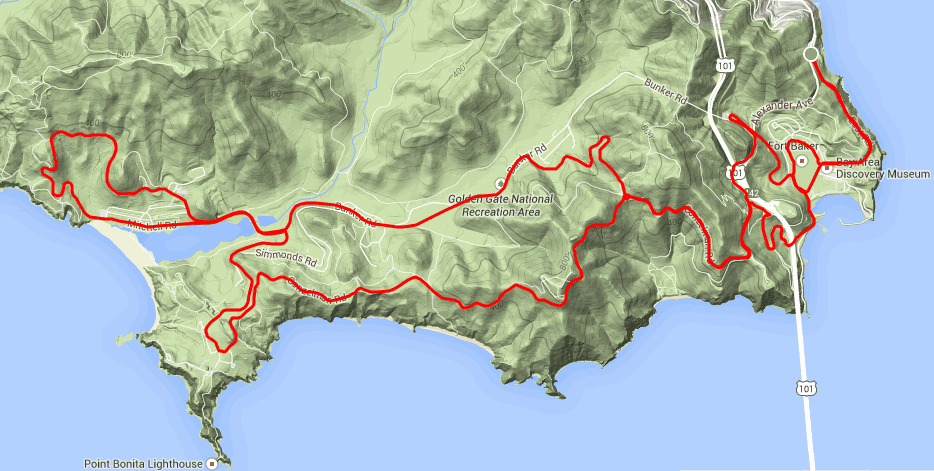 At 20 miles and with 2,000 feet of climbing meander this jaunt through the former army bases that make up this part of the GGNRA is as scenic as it is enjoyable (or it can be as tough as you want it to be).