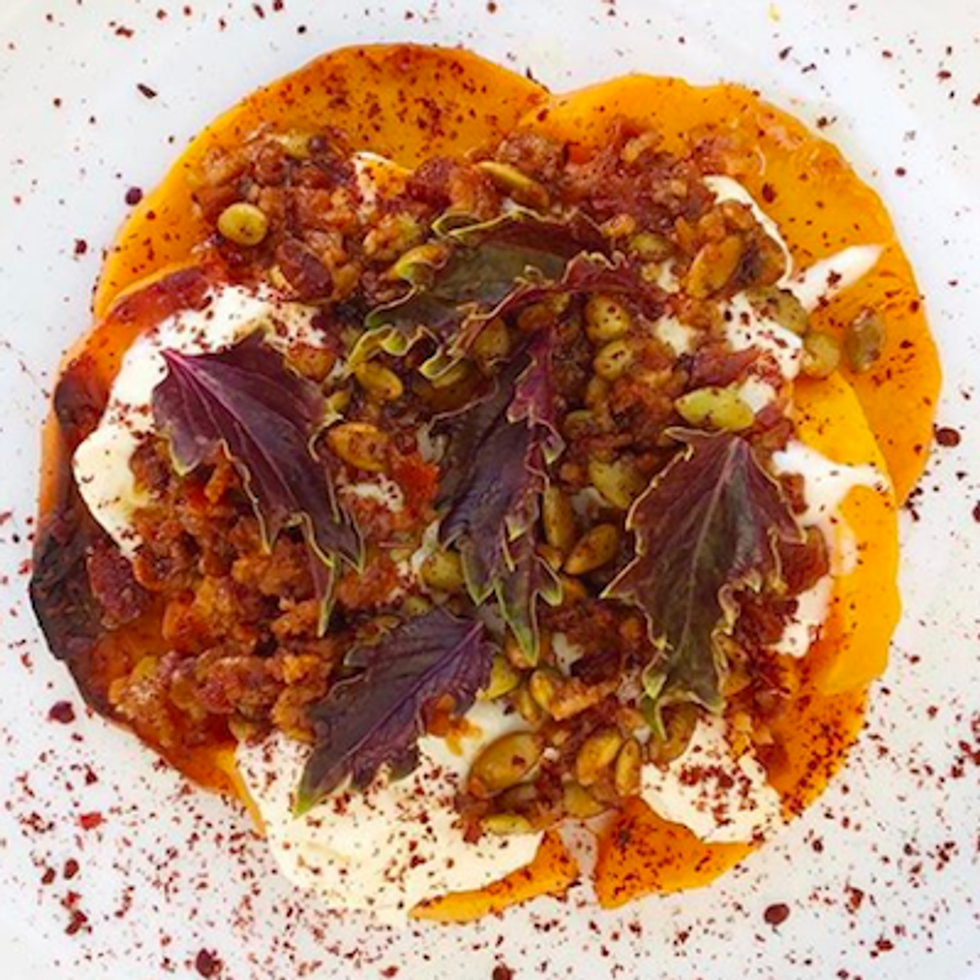 Roasted butternut squash with burrata and basil.