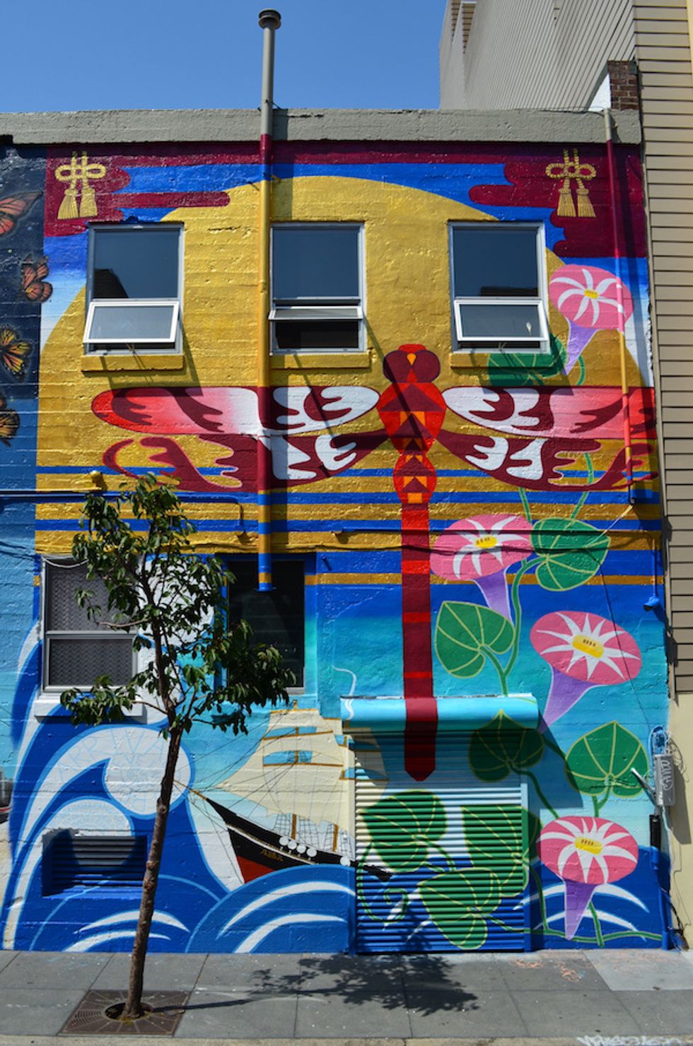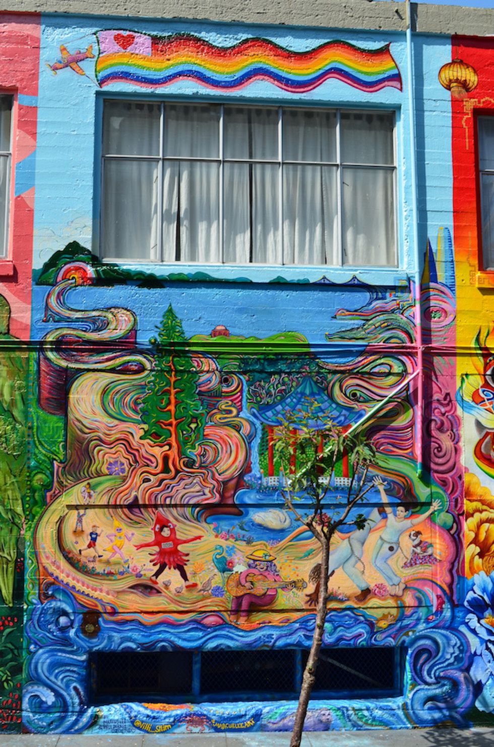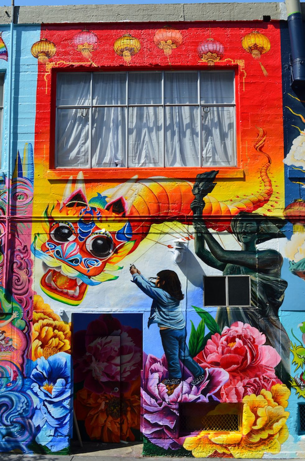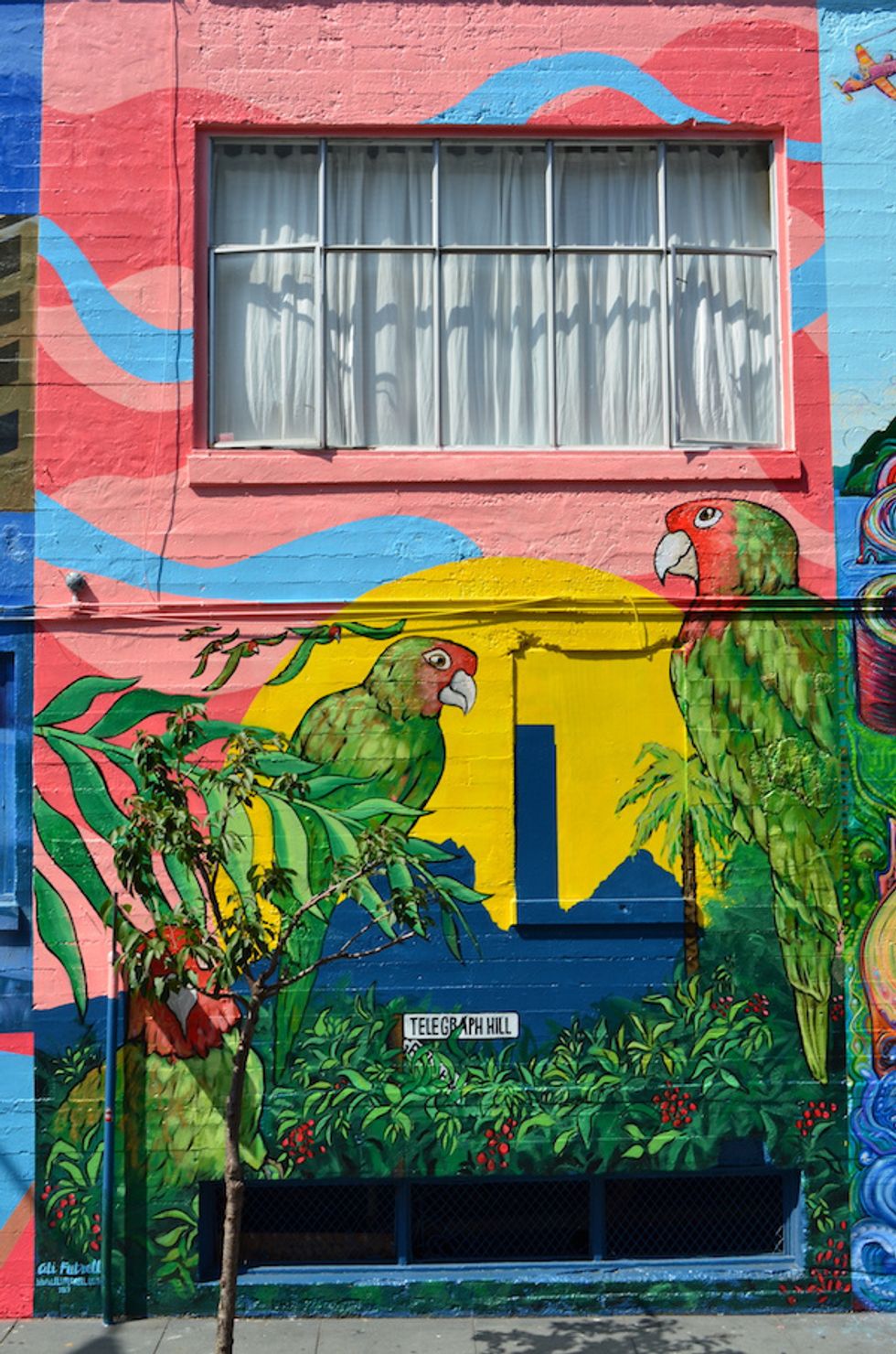 Unveiling today, the Hemlock Alley Mural is a vivid six-panel creation, spanning a 140-foot wall, by a half-dozen local artists who've paid homage to the history and diversity of San Francisco culture. Each piece highlights an iconic neighborhood: 2017 SFAI grad Ali Futrell brightly captures the parrots of Telegraph Hill; Twin Walls Mural Company tells a story of Chinatown; Mel Waters, known for his 19th Street Santana mural, taps into the Mexican heritage of La Mission, and more.