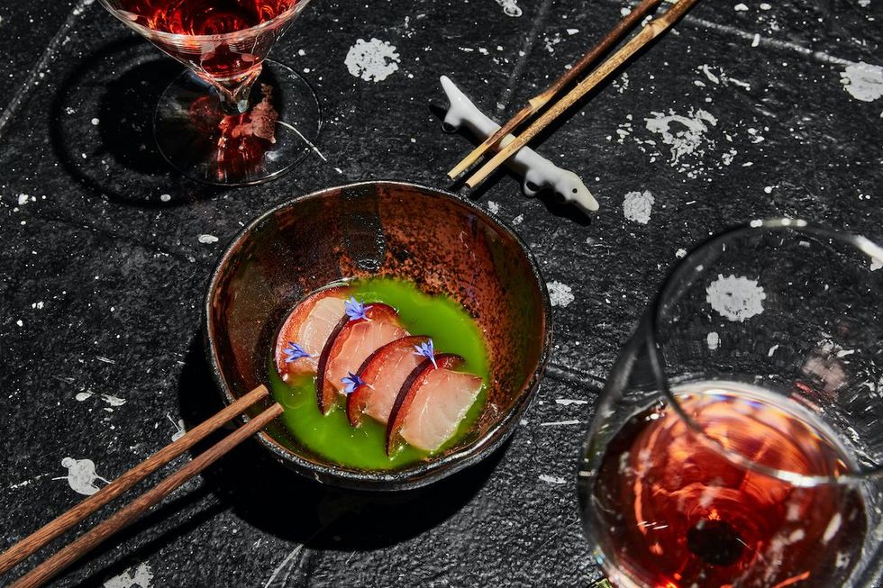 It’s no secret that Imana has designs on a Michelin nod and, as I devour the dishes one by one, I can see her star rising. The squab tostada (substituted with mushrooms in my case) is meaty and cravably seasoned. The cashew queso, a molten vegan cheese dip made with caramelized onions, jalapeños, and house-made tortilla chips, is lick-the-bowl-clean indulgent—and the only dish that’s consistently shown up on the menu since the restaurant’s pop-up days. The raw halibut with miso, cashew slaw, and blue corn tortillas is a burst of intensely delicious flavor.