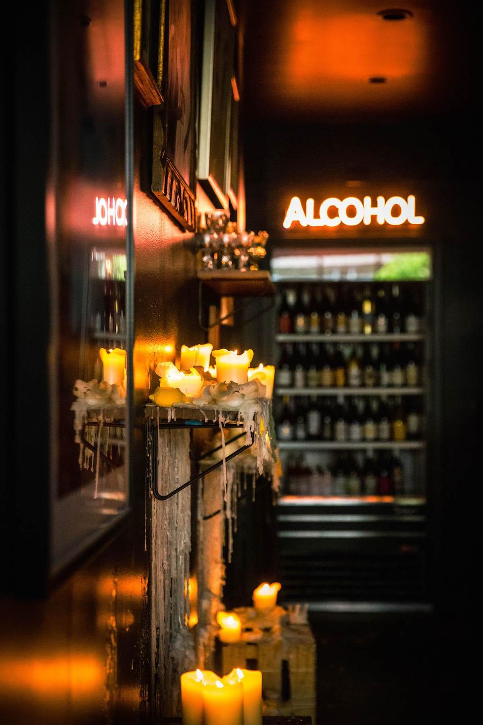 Inside, candles burn everywhere, their wax hanging low like vines from tree branches, their flames flickering against the bar’s onyx tile. Campy, intentionally ridiculous artwork—sad-faced clowns, oddly proportioned portraits, brightly colored abstracts—hangs everywhere. On one wall, the restaurant’s name Hi Felicia, which inverts the slang send-off “bye Felicia” to welcome those who don’t always fit in, is painted in stark white against black brick.