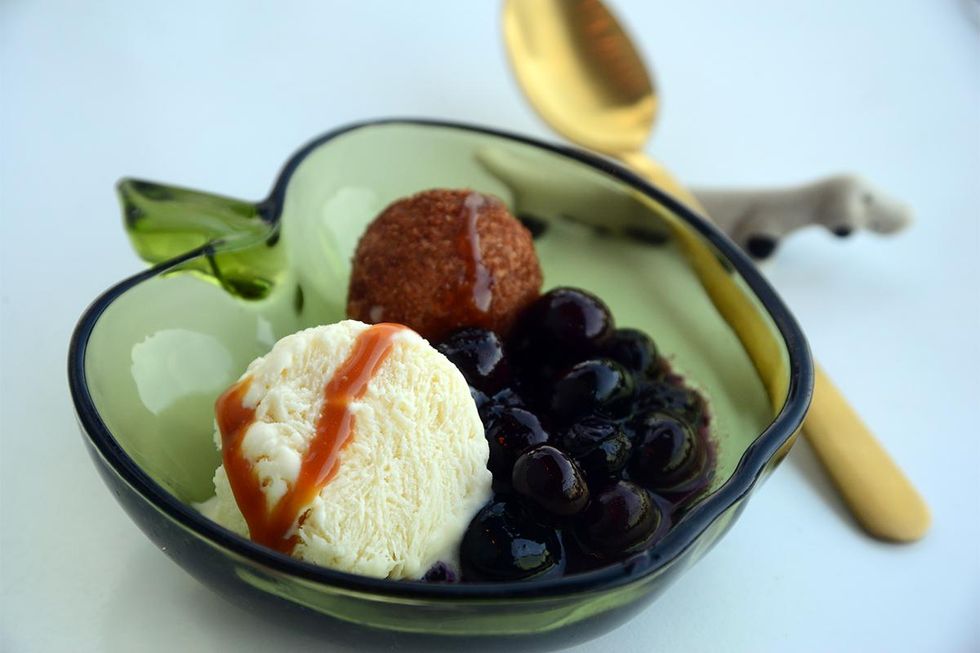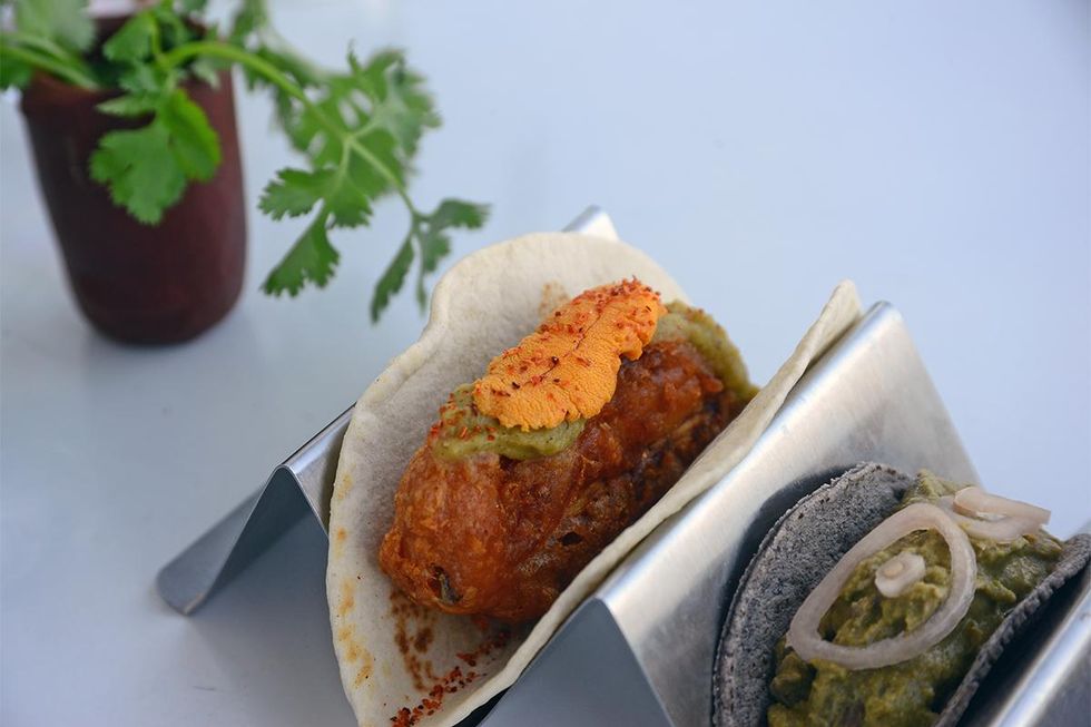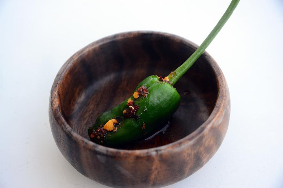 Gradually, the heat increased by way of a diminutive burrito with eggs, fried potatoes, and pork sausage draped with a dark crimson salsa macha, a fiery concoction of fried chiles and nuts that originated in Veracruz and Oaxaca; then a pretty little padrón pepper with olive oil, salt, chile oil, and a spice mixture with Sichuan peppercorns that imparted a peculiar tingling sensation; and a lamb enchilada with corn, cherries, cherry tomatoes, a compelling blend of Mexican and ricotta cheeses, some crispy-cool iceberg lettuce, and an intensely hot pickled habanero crema.