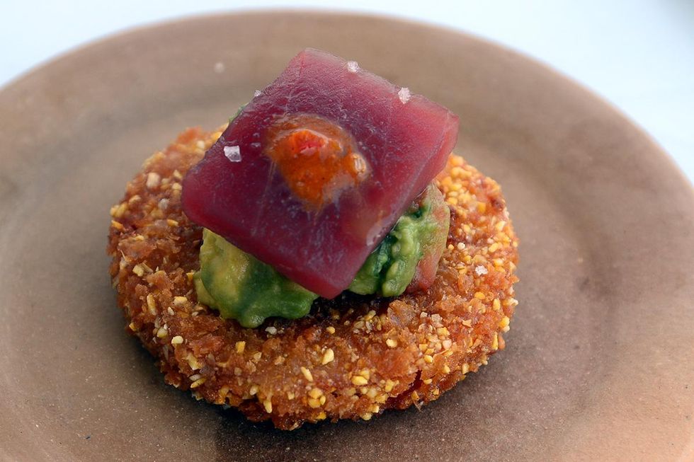 I don't get high much, but I was feeling a major buzz from the slow burn that is Imana's signature. "I love spicy food," she said. "There's so much hot sauce in my fridge. If it's not spicy, I don't like it. It hurts so good and you're fucking crying." And even though I'd always thought I had a low spice tolerance, there was something magnetic in the intensity of the poblanos in a walnut-pecan-cashew queso seasoned with onion and garlic powder; and the Thai chile in Imana's "pico de gallo bite," a colorful assemblage of gold heirloom and red cherry tomatoes garnished with a peanut and a scatter of green onions; and the fermented hot sauce on the little slab of bluefin tuna atop a dollop of guacamole atop a deliciously crunchy-juicy panko-crusted fried tomato.
