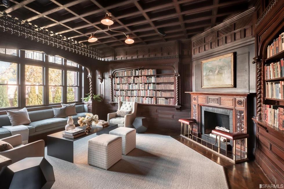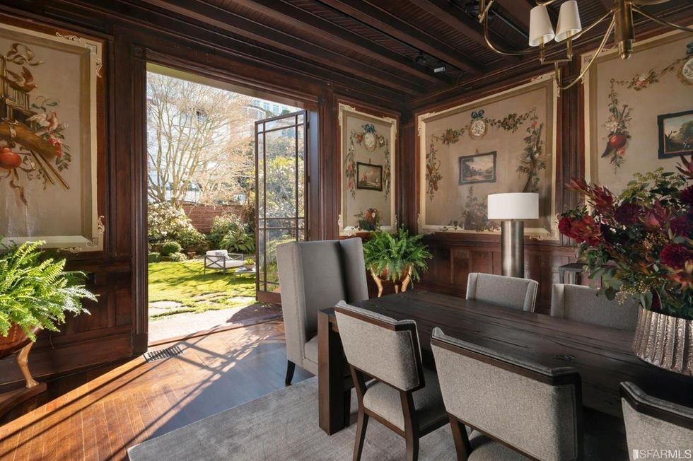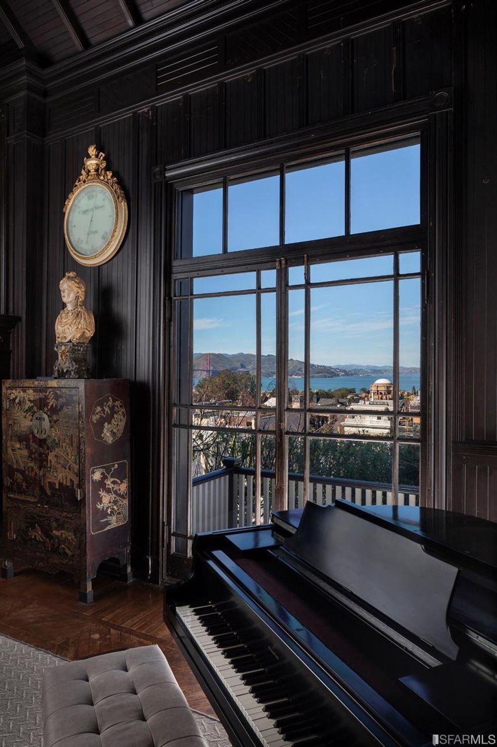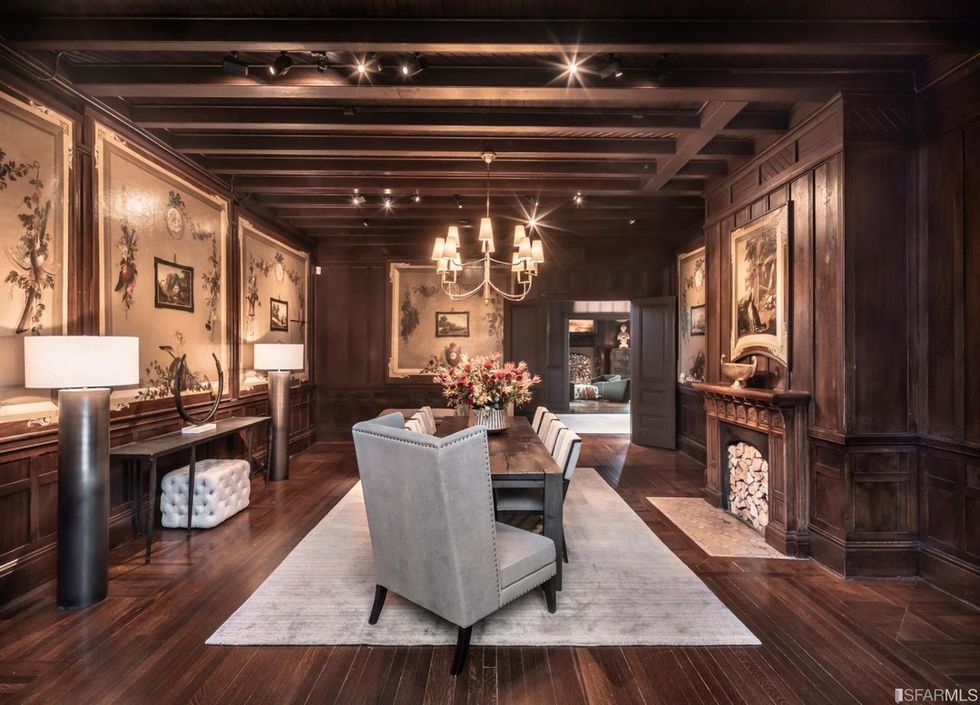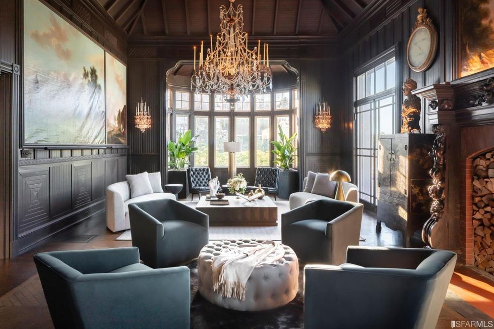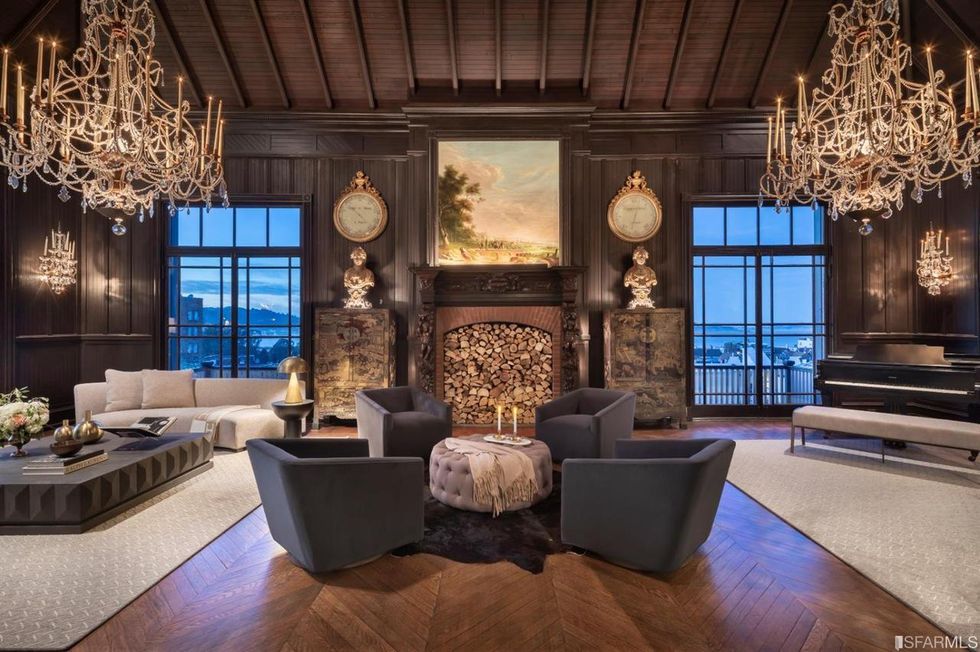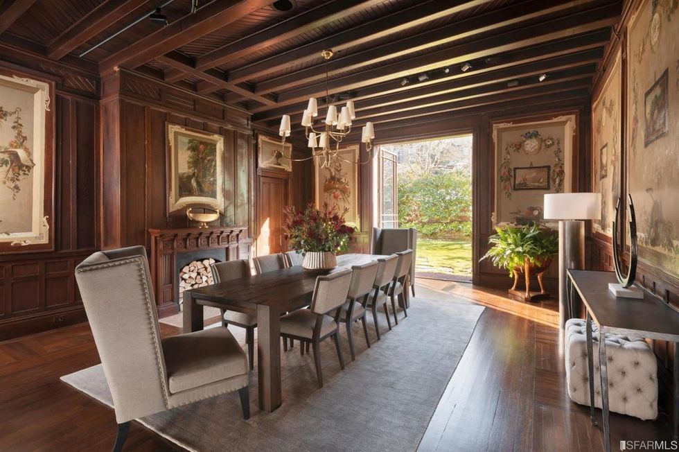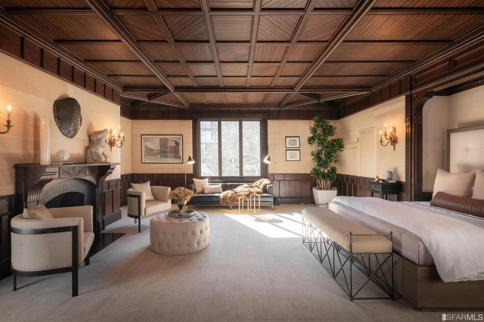 The vibe is expectedly stately throughout. The living room, which spans the entire width of the house, has 20-foot vaulted redwood ceilings and dramatic, glittering chandeliers. Large bay windows punctuate two sides of the space, and walkout balconies promise a view of the Palace of Fine Arts, Alcatraz, and the Golden Gate Bridge. An intricate fireplace with inlaid woodwork anchors the space.