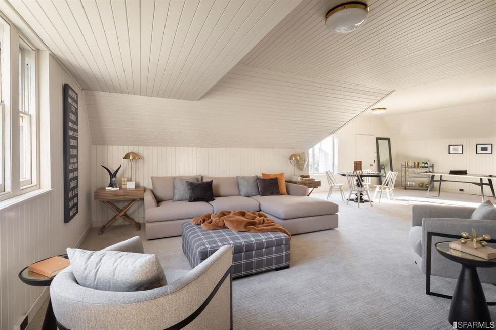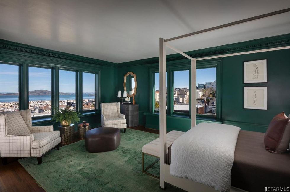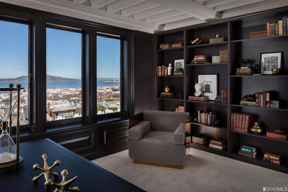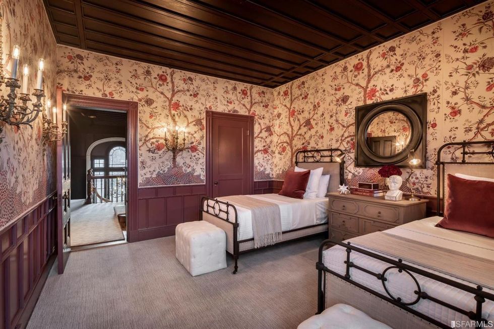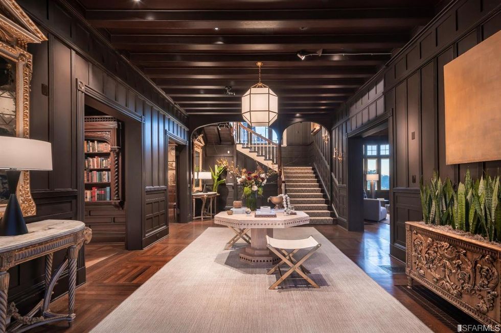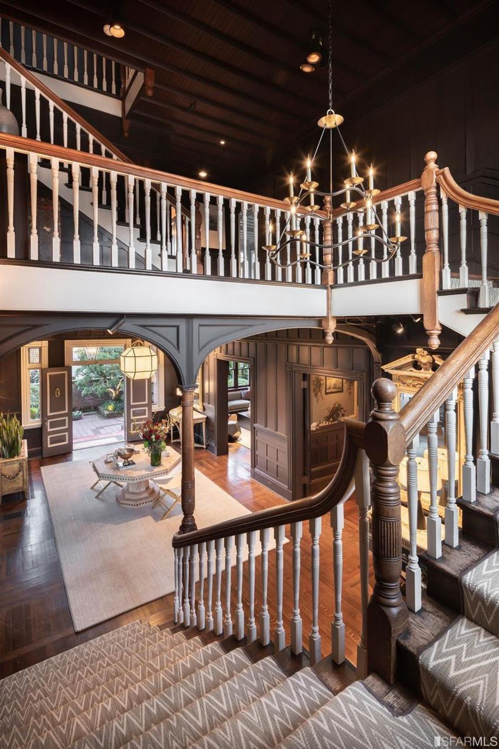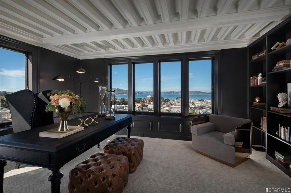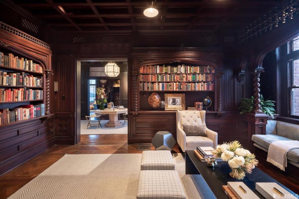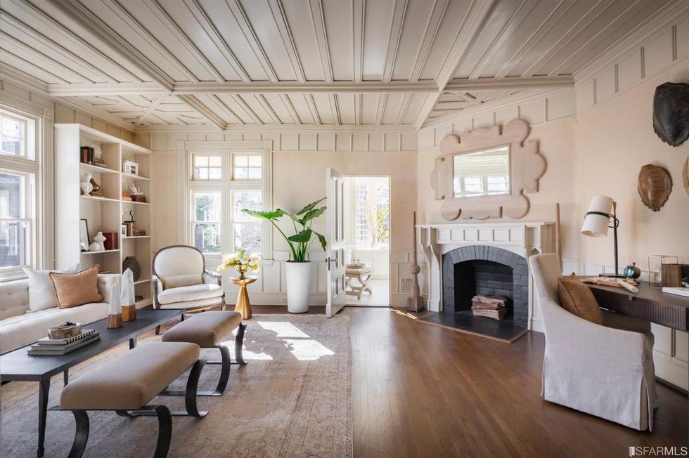 The vibe is expectedly stately throughout. The living room, which spans the entire width of the house, has 20-foot vaulted redwood ceilings and dramatic, glittering chandeliers. Large bay windows punctuate two sides of the space, and walkout balconies promise a view of the Palace of Fine Arts, Alcatraz, and the Golden Gate Bridge. An intricate fireplace with inlaid woodwork anchors the space.