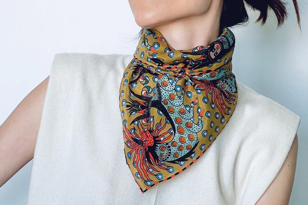Wrap her up in joie de vivre with a colorful bandana from SF designer Ayca Kilicoglu. Made of a cotton-silk blend, the Sahmaragon bandana ($55) is one of many playful styles starring the artist’s hand-drawn illustrations. Whether paired with a white tee or black turtleneck, this 21-inch square brings a twist of chic. P.S. Fans of “The Bear,” will be particularly excited to know the scarves have been featured on the FX show—worn by sous-chef Syd, obvi. // Shop online at murbyayca.com.