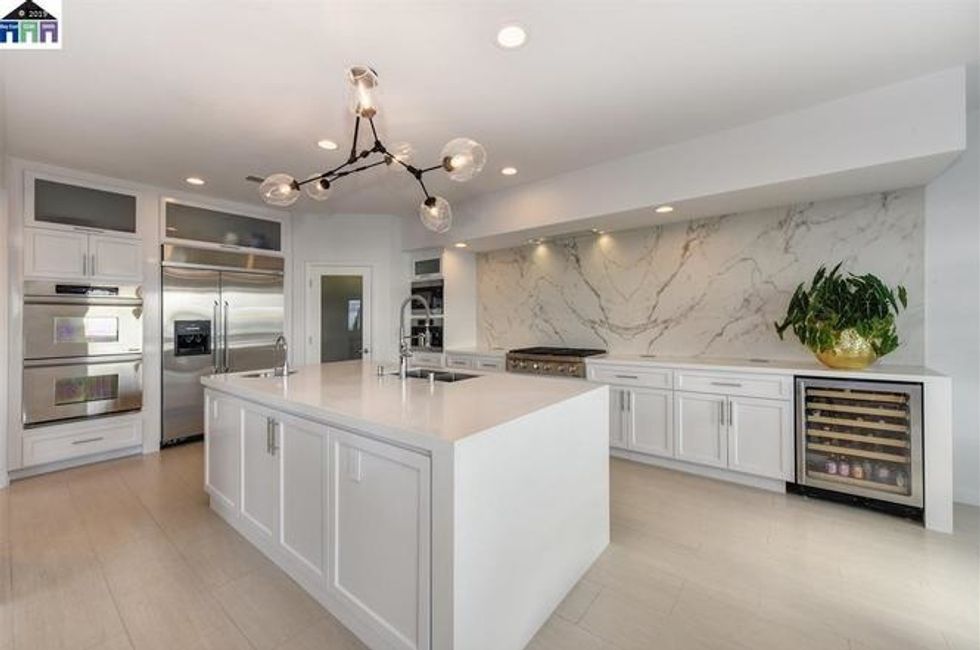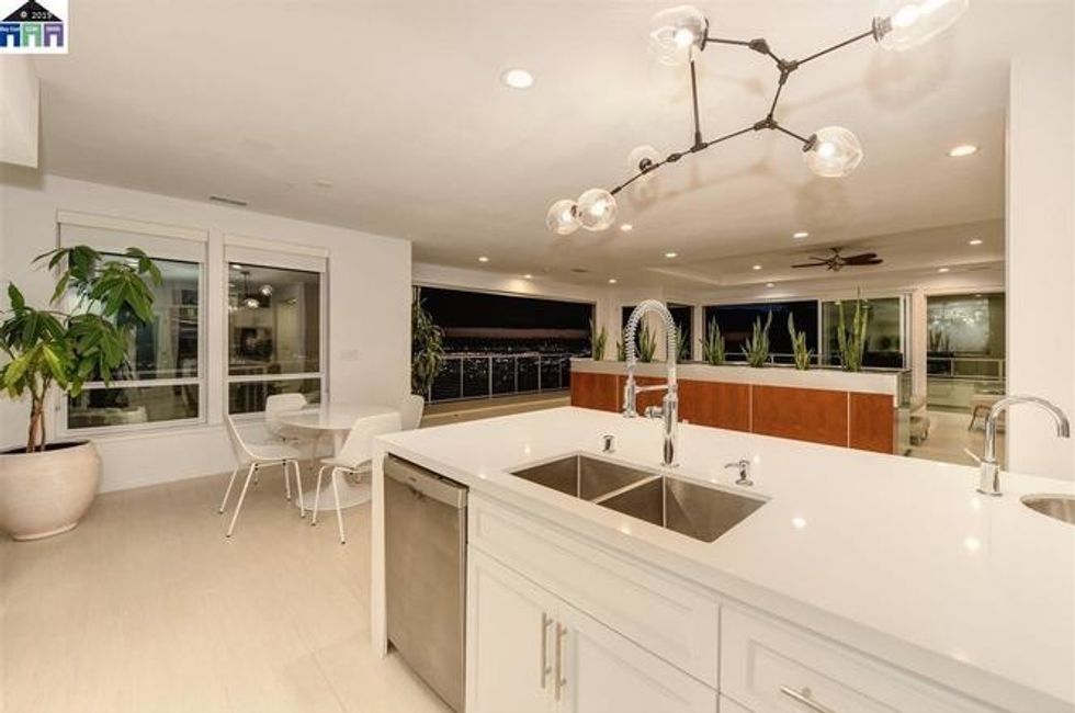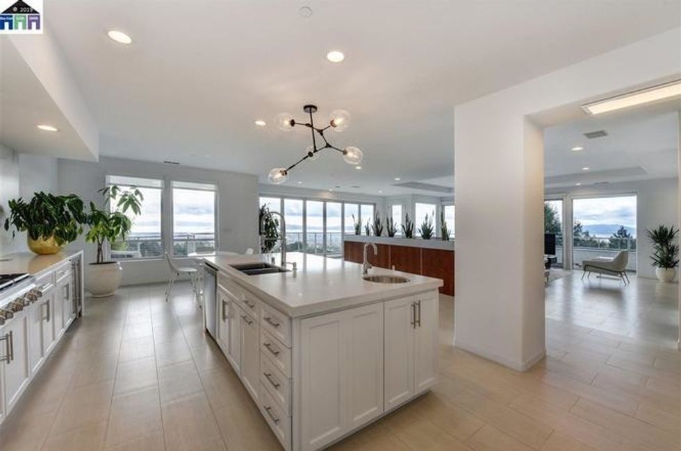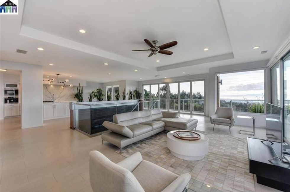 The luxe, modern casa with endless relaxing amenities embodies slow California living. The white marble-clad kitchen resides on the top floor, where an open floor plan leads to a breakfast area, one bedroom with an en suite bath, and a spacious living room with large windows that wrap around two sides. An entire wall of folding glass opens up to a balcony with 270-degree panoramic views.