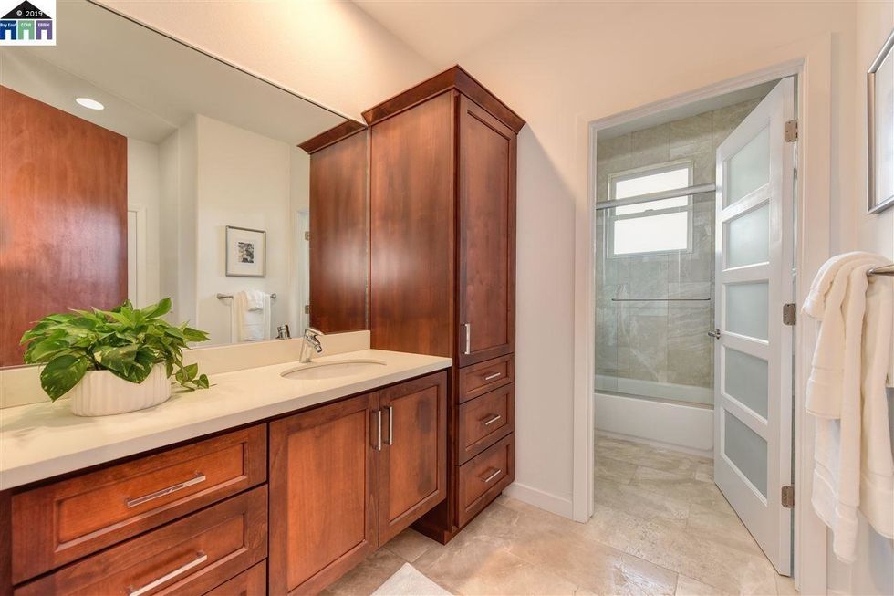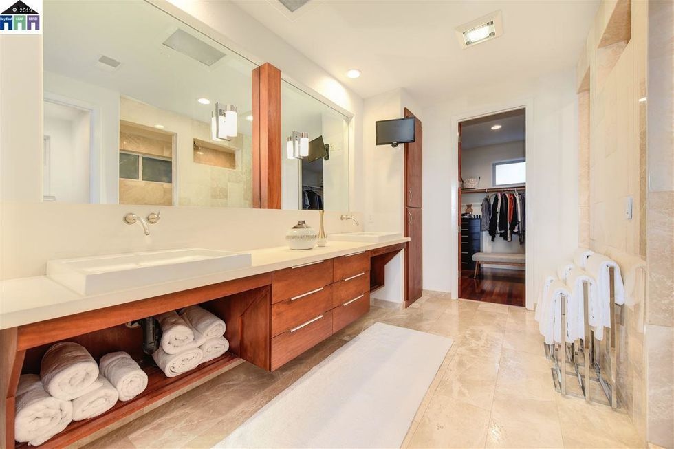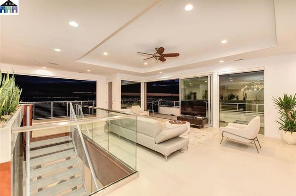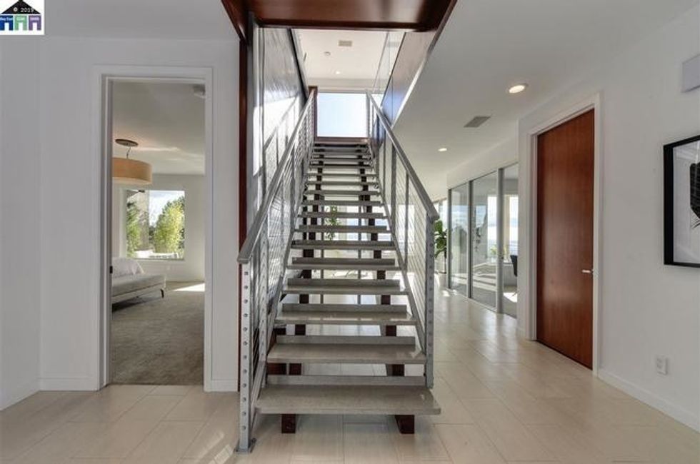 Make your way down quartz steps to the second floor, which has two sitting areas, an office, and an additional bedroom. The master suite also sits on this level with its walk-in closet and a large, double-vanity bathroom cloaked in marble and wood and with a soaking tub overlooking the bay.