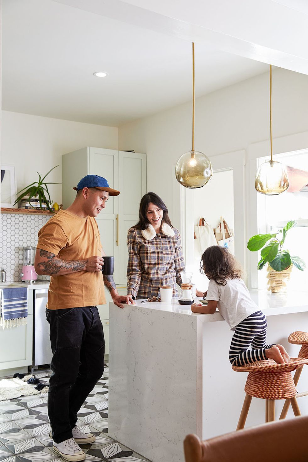 "My husband and I are pretty compatible and eye-to-eye most of the time, and really loved the color and light feel of the Semihandmade cabinetry in the kitchen, but I really wanted a super patterned ceramic Fireclay Tile to complement it, which is actually hand-painted in Sausalito."