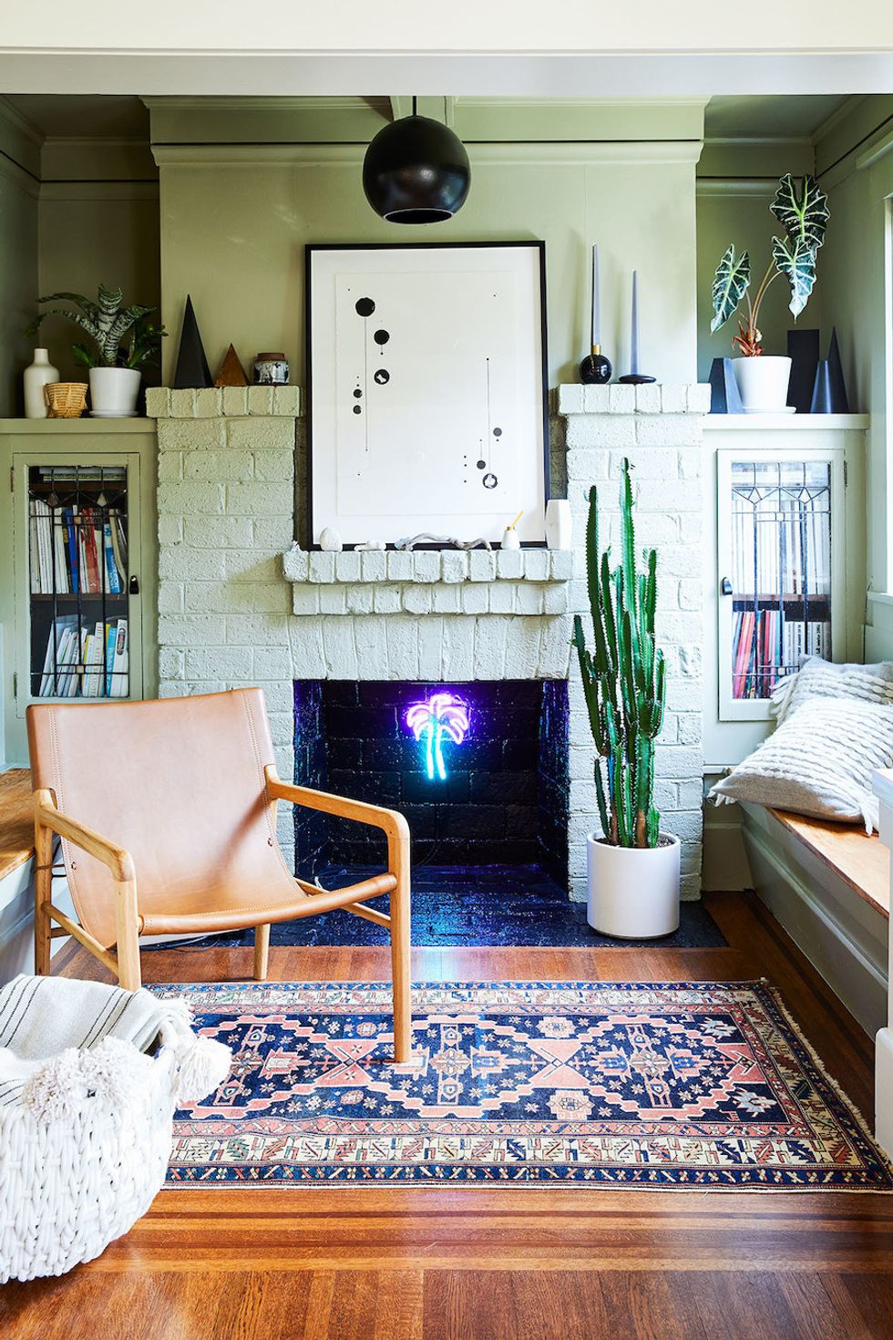 The couple gave new life to the unoccupied nook with a splash of black paint and a playful neon palm by Meryl Pataky embedded within. Gorgeously green walls and minty fresh brick add an organic element to a cleverly utilized, otherwise redundant retreat. Books are neatly stacked behind glass cabinetry, while various living things and modern, monochromatic ceramics dress the mantle.