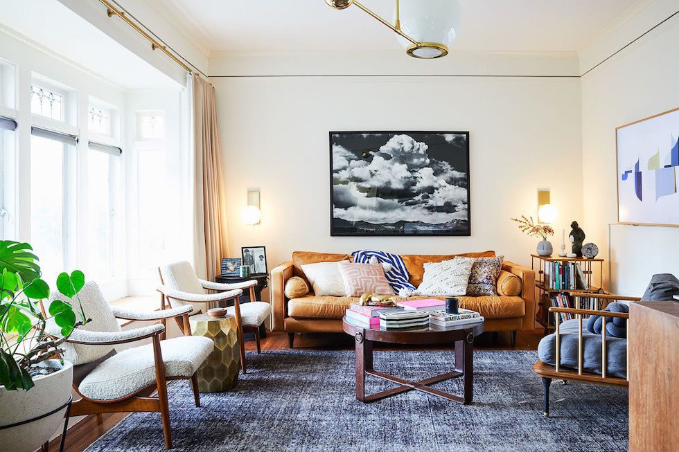 Each of the cozy yet contemporary living spaces speak to the family's signature style and laid-back approach. A tan, leather-clad sofa by Article anchors the living room along with natural-colored drapery by The Shade Store, while a dreamy print of rolling clouds (sourced via Minted) completes the picture.
