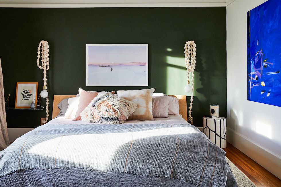 An electrifying blue, painterly oil on canvas by Bailey hangs adjacent to the couple's bed, while a deeper hue of green—Vogue Green by Sherwin Williams—gives the space depth and an element of richness. Convenient bedside outlets receive a subtle pop with brushed brass wall plates by Legrand.