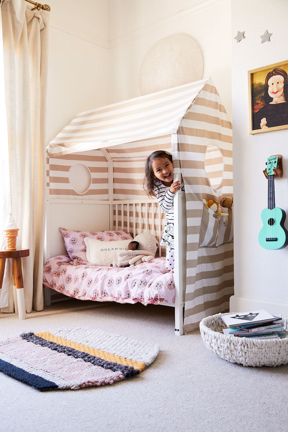 Tallie's bedroom, a childlike oasis that conjures up adventure, is dotted with cute conversational pillows by Hill House Home that read "dream big." Organic drapes by Barn & Willow and caramel colored stripes on a Stokke tent bed complete the overall vibe.