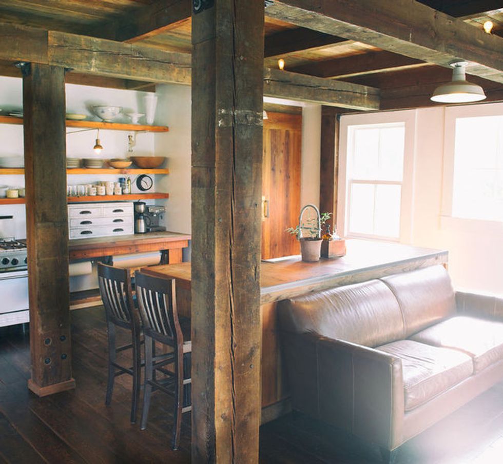 They removed the walls that enclosed the kitchen, using reclaimed wood for the support beams, ceiling and floor. "I'm a minimalist," Pattee says, explaining the open shelves and sparse furniture arrangements. "I prefer to have open space in my home—it also comes in handy for photo shoots."