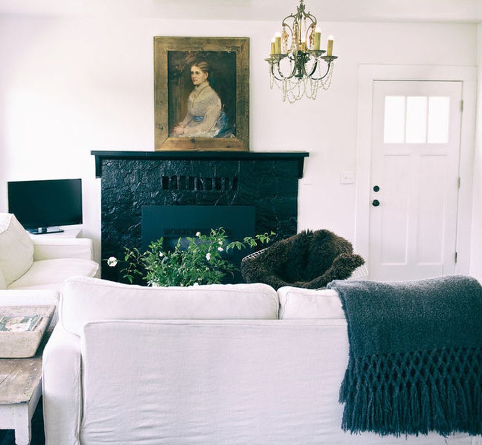 The fireplace was originally raw fieldstone, but Pattee didn't like the color of it, so she painted it — and then painted it again, and then again. "It's been two shades of white and now black, and I'm planning to give it a gray coat," says Pattee. "It's an easy and contained surface to paint, and it can change the look of the room instantly."