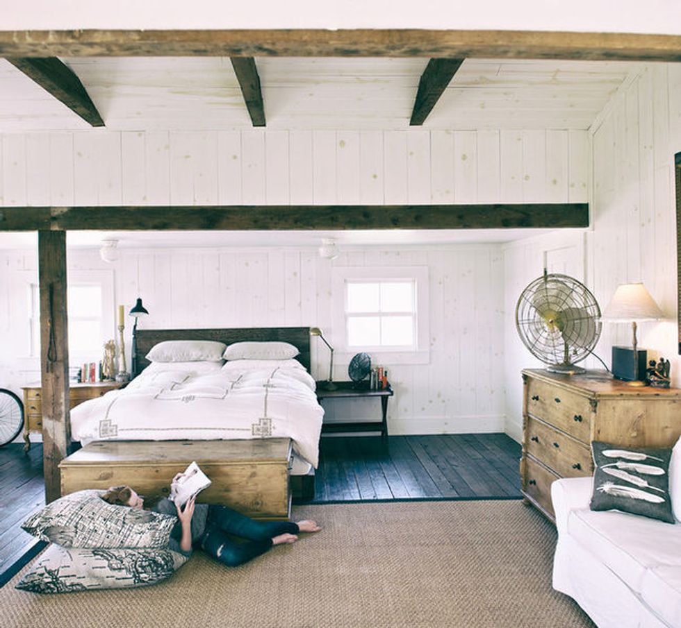 The master bedroom is large and also serves as Pattee's office. The visible pine knots are unintentional. Since the couple wanted the look of painted boards, Albright installed knotty pine, the least expensive material they could find. Pattee, weary of painting, hired a professional to apply the same white used everywhere else. He used the wrong primer, and after a few weeks the knots began to show through. "We love the way it looks," says Pattee. "We consider it a happy accident."
