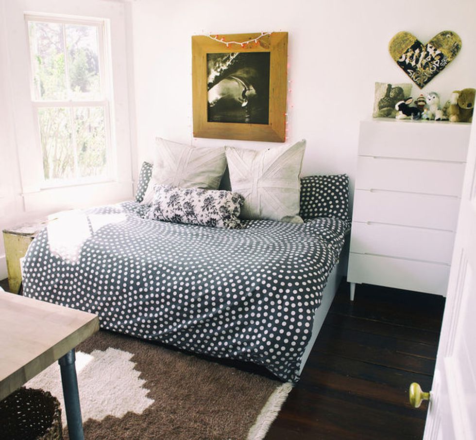 A mix of found tables, dressers and a chest take care of the couple's storage needs. "I really don't like symmetry," says Pattee. An enormous fan, another roadside find, fits in perfectly with the family's neoindustrial farmhouse style. Pattee says although it looks almost like an art piece, it's completely functional. "It sounds like an airplane taking off, but it does it's job," she says.
