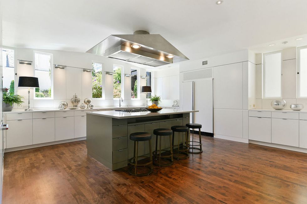The kitchen is somewhat surprisingly, and thankfully, quite modern and fully equipped for any home chef. Through the swinging doors into the laundry room, you'll find a secret dumbwaiter hidden behind a large mirror—just one of the many surprises the flamboyant home has to offer.