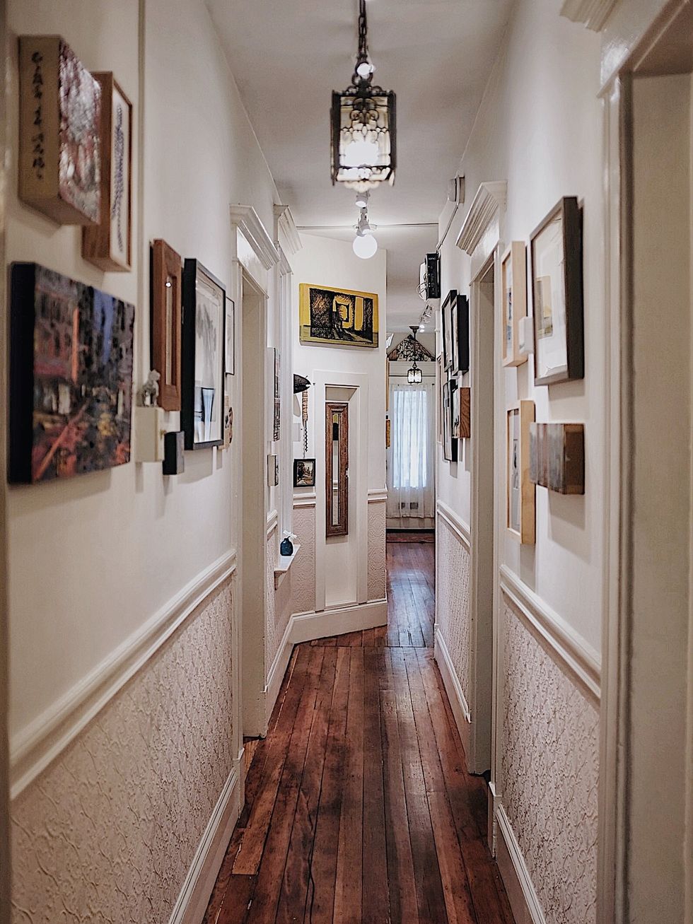 In the couple's Edwardian home, 40 feet of hall space means room for 46 pieces of art, including works by locals Carolyn Meyer (foreground at left) and Jon Rogers (the yellow piece at back).
