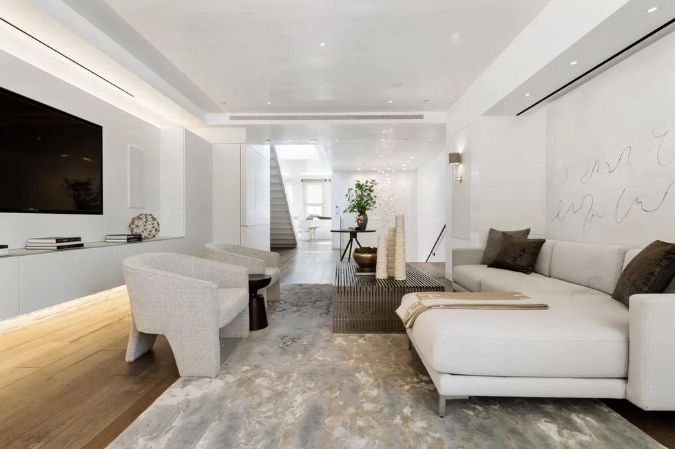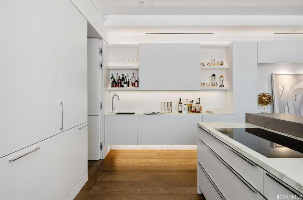 The kitchen has built-in appliances, a large walk-in pantry, Neolith Calacatta slab marble countertops, and a full wet bar. When the chef wants privacy from the party in the adjacent dining room, she or he must simply raise an on-demand dividing wall.