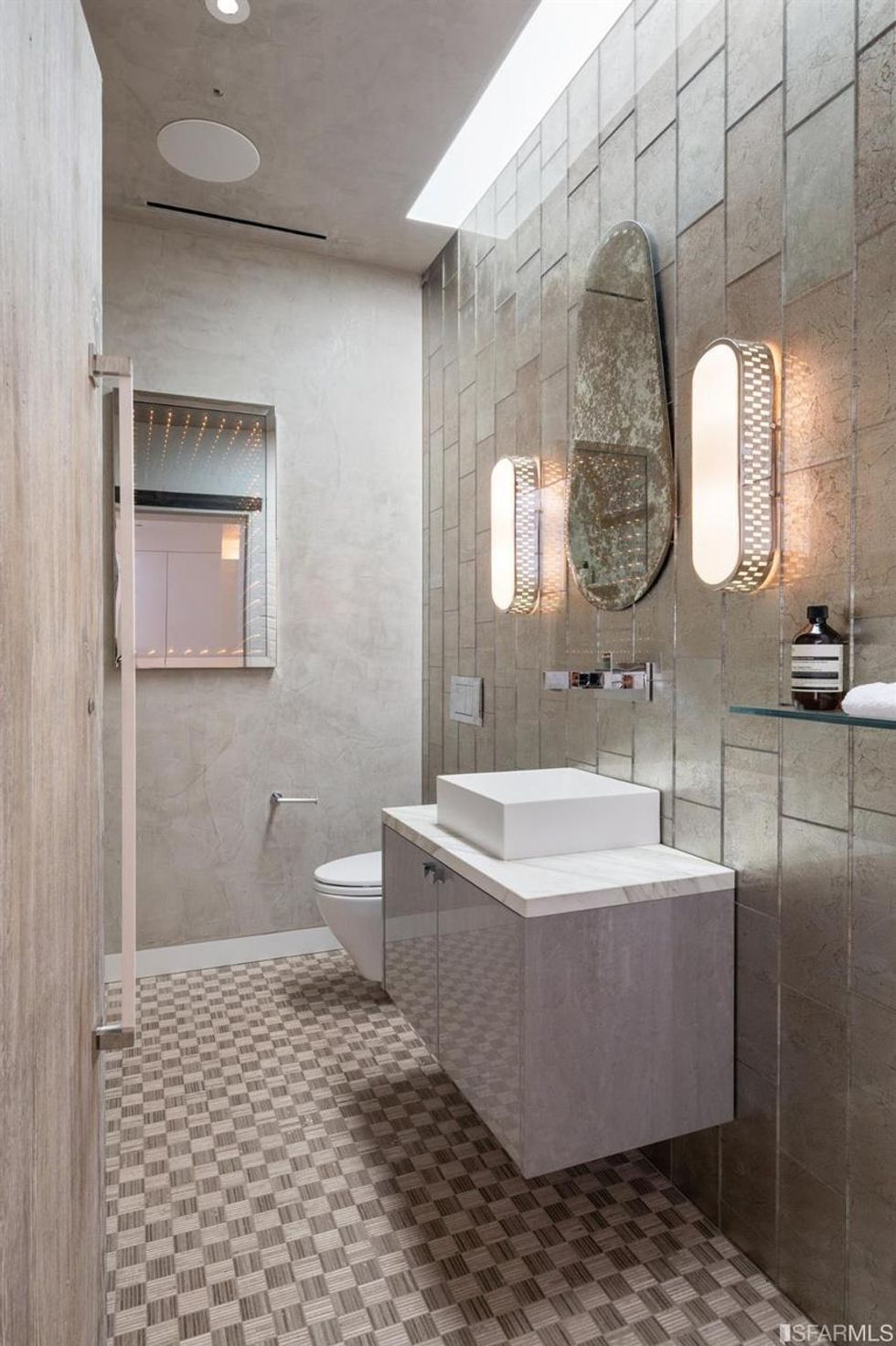 The nearby powder room is a glamorous experience of its own with a floating vanity and a backsplash wall tiled in antiqued mirror.