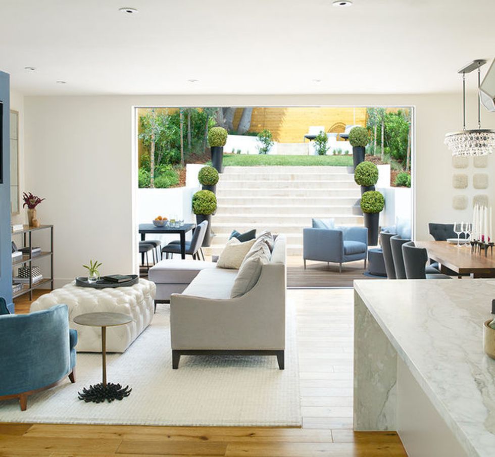 The indoor/outdoor great room gives the homeowners two dining areas. Outside in the modern, manicured garden, Jones went with simple black furniture.