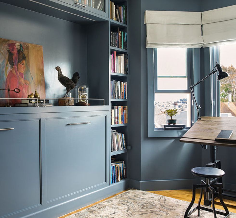 The top floor consists of two rooms: the master bedroom and a library, shown here, where moody blues wash over the cozy space. The room works triple duty as a home office and guest room. A wall panel folds down to reveal a custom single bed.