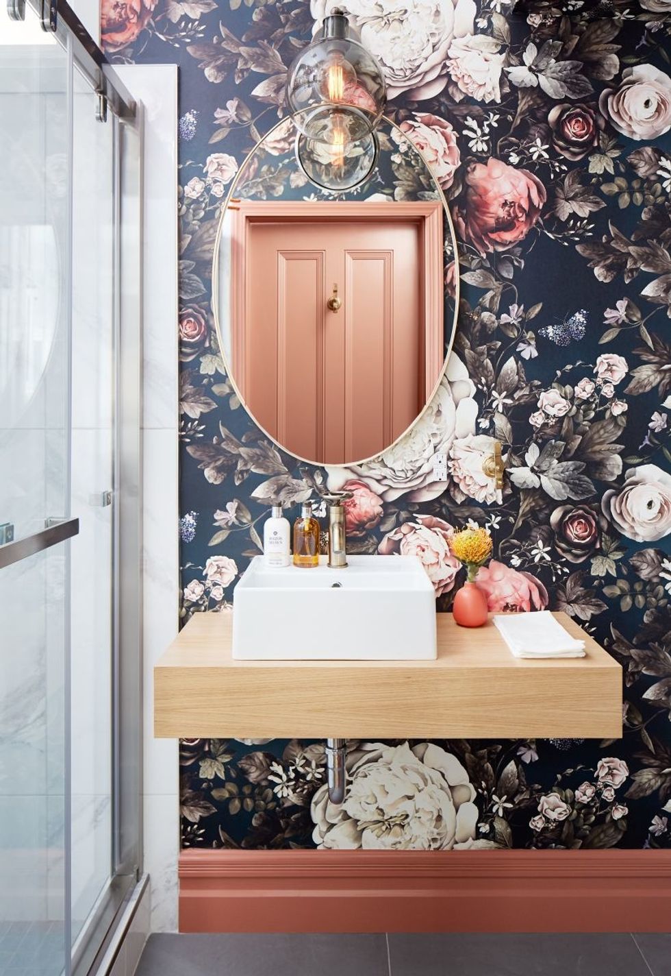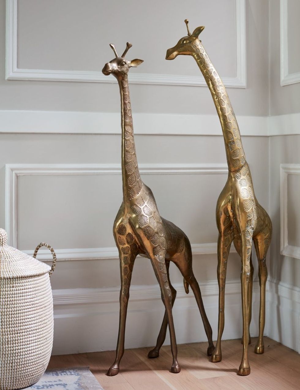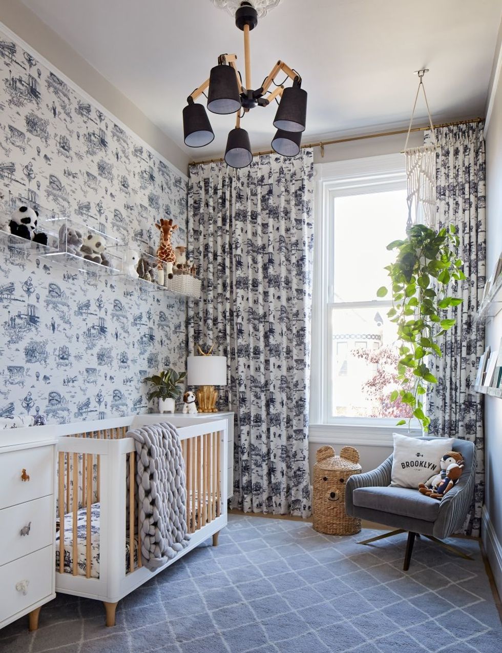 Other spaces, however, take on a life of their own. Fresh, bold accents mirror her personality and are seen in the patterned dog nook beneath the stairs; in the powder room swathed in floral wallpaper and coral trim; and in a pair of copper giraffes cozied up next to the fireplace in the living room. The nursery, too, is teeming with fun patterns in the toile wallpaper and curtains. A gilded rabbit lamp, bear clothing hamper, and stuffed animals piled onto clear acrylic floating shelves make good company for Brooklyn.