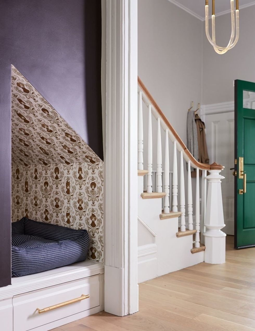The flow of the two-story house wasn't conducive to a family of four, so she made a slew of updates including rearranging the kitchen into an L shape and adding more square footage. To maximize space and storage, they added a new gas insert for a slim fireplace, a hideaway for Cashus, and an entirely new lower level, excavating four feet. Within that space, there's a play and gym room, large bathroom with a steam shower and double heads, a closet, and of course, more storage.
