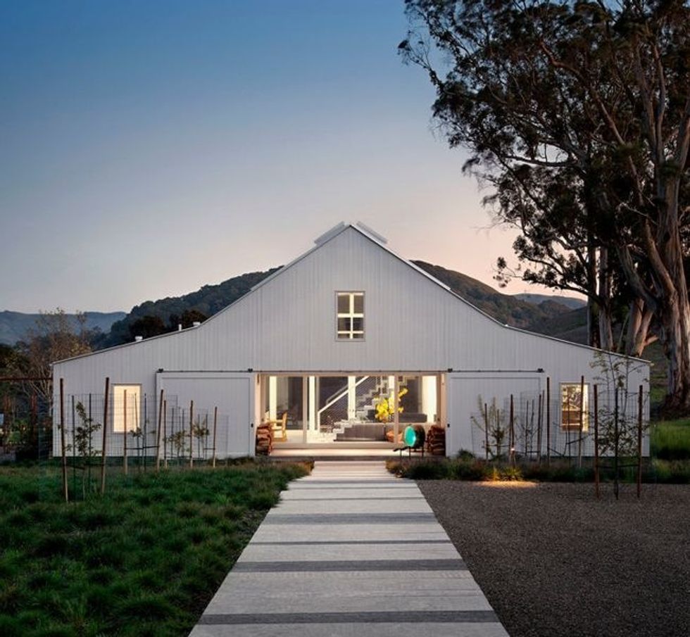 Most of the houses in this area of Sonoma County, California, are built atop the surrounding knolls. But to reach this dwelling, a visitor has to traverse the rolling hills before dropping down to the sheltered homestead. As you come up the walk to the front door (a glass portal behind traditional sliding barn doors), a sense of déjà vu comes upon you. The house seems enduringly familiar, as if the architects used some kind of sorcery to tap into our collective unconscious to channel the image of a half-remembered agrarian spread.