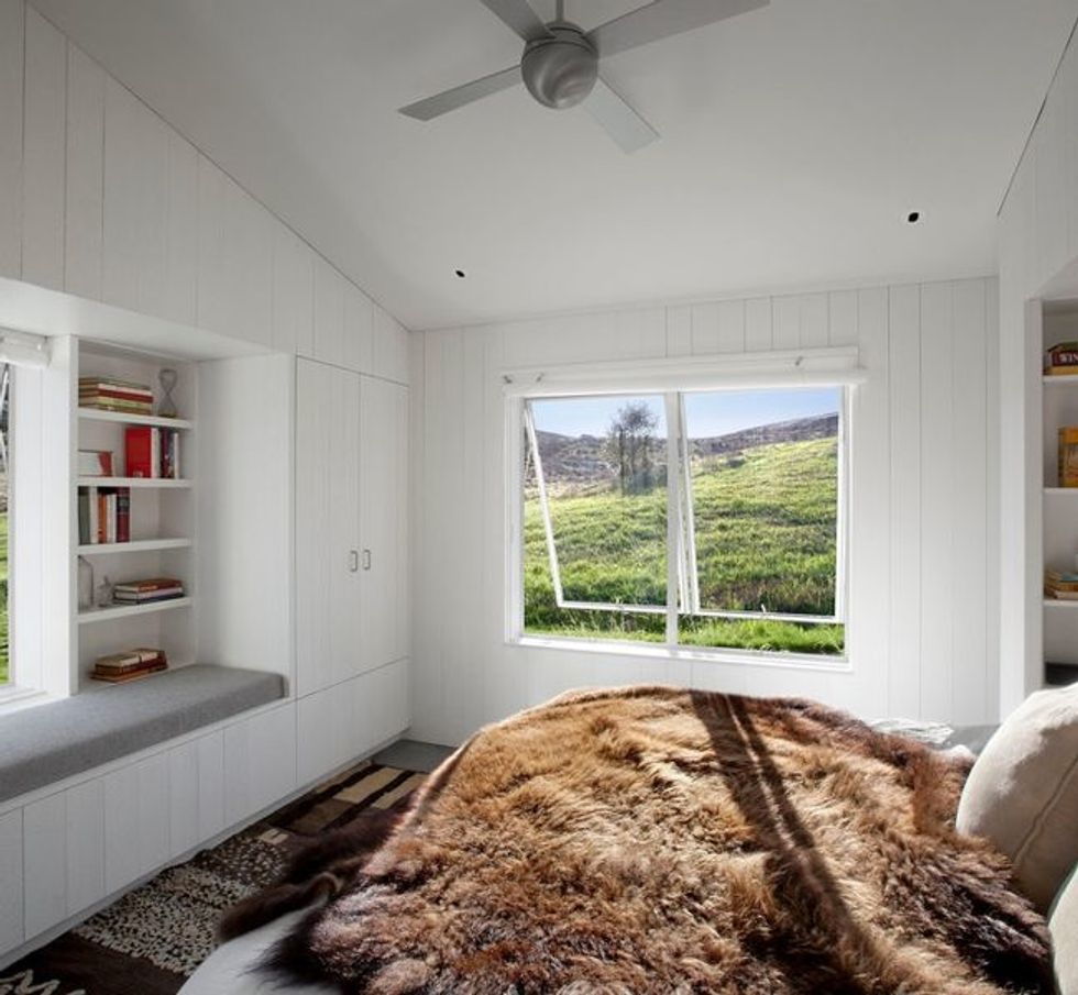 Houses designed by Haesloop's firm tend to need less furniture. "The philosophy is that there should be places for people and places for things," he says. Shelves in a niche by the bed in the master make sure a book is near at hand when the owners settle in for the evening. Similarly, there are built-in shelves by the long window seat where they can sit and enjoy a book or the view.