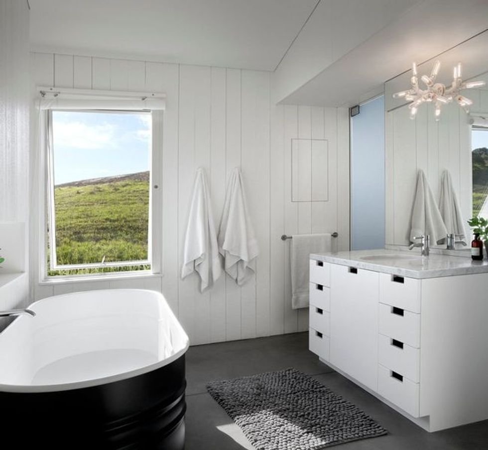 In keeping with the farm-inspired nature of the home, the master bath features the Vieques tub by Patricia Urquiola. According to the architect, the tub was modeled after industrial military equipment, but anyone who is familiar with rural life will read it as a cattle trough.