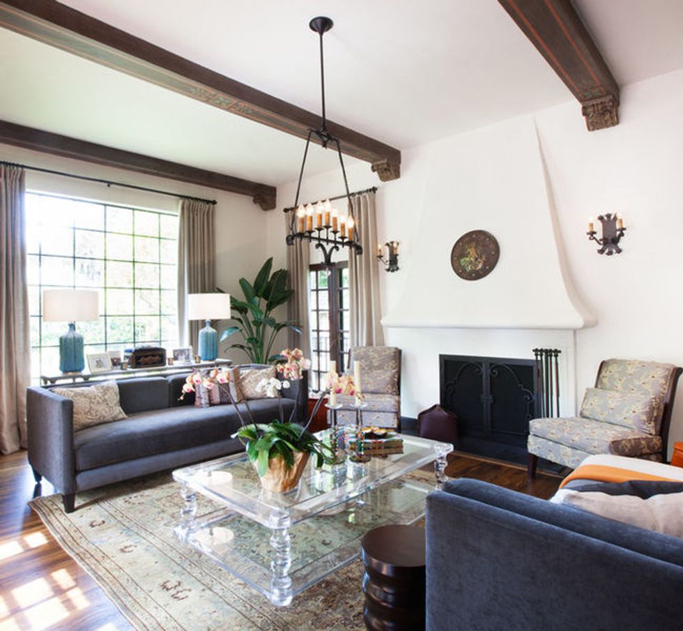 A year after moving in, McIntosh noticed a faint shadow on both sides of the fireplace wall and realized that sconces had once been there, so she found these antique sconces from Rejuvenation and a coordinating chandelier to hang from the ceiling. Above the fireplace is an antique metal shield with Spanish dogs that resemble lions.