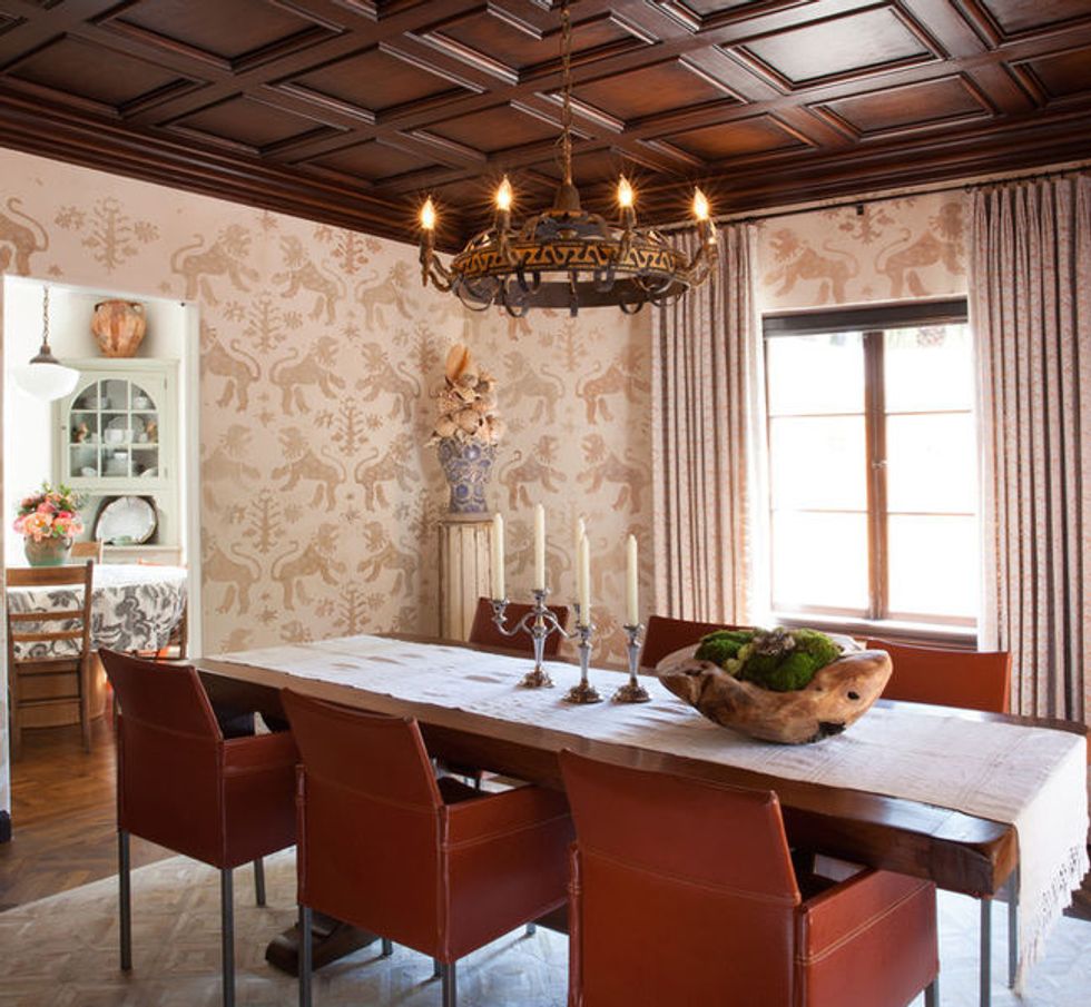 The dining room's paneled ceiling and chandelier are original to the house, and existing wall mounts told McIntosh exactly where to hang new coordinating sconces. She wanted to do something decorative with the walls, but she didn't want to paper over the beautiful plaster. So she found a fabric designed after a 16th-century Spanish document at Groves Brothers, a Texas textile manufacturer that uses a Venetian-style printing and dyeing process to create fabrics that resemble antique documents.