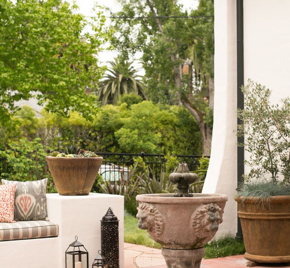 The courtyard was also completely revamped, in partnership with a landscape architect who created a path from the sidewalk to the front door and enclosed a seating area at McIntosh's request, to give the courtyard a "presence" and create more usable space. A previous owner had installed a fountain with a lion's head in the entry court; it now ties in with the dining room wall treatment and the decorative shield in the living room.