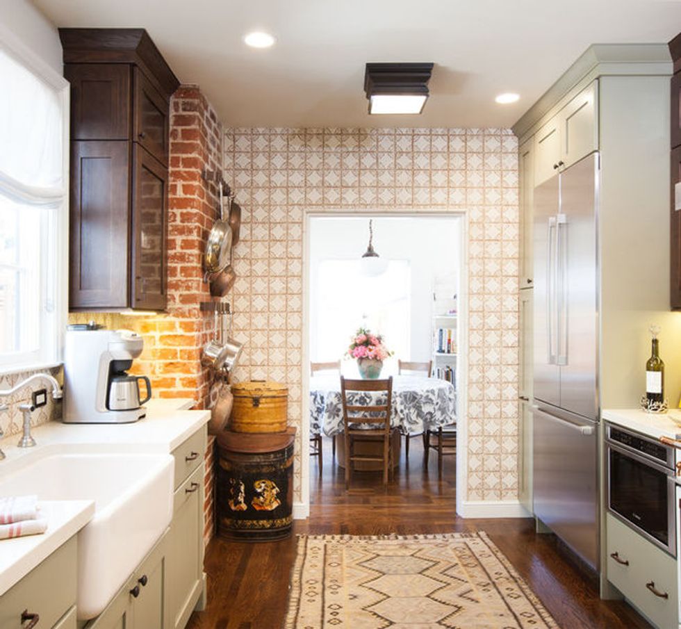 She decided to preserve the old brick chimney that runs from the basement through the kitchen and up to the top floor. The previous owners had their range right next to the chimney, but they had partially covered the brick with a tile backsplash. McIntosh removed the tile and mortar to expose the brick again, without polishing it up too much since its age was precisely the source of its charm.