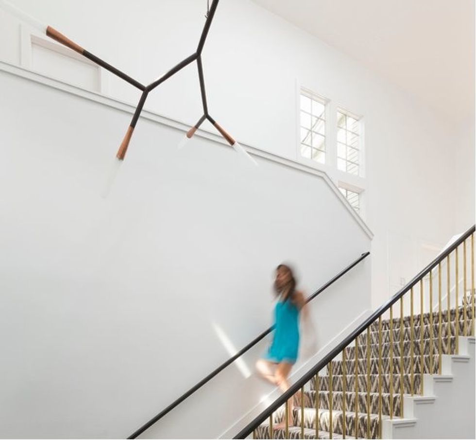 "We wanted that space to read beautiful, warm and welcoming." Part of that involved hanging the light fixture over the staircase lower than normal, giving the illusion of a more intimate space. Instead of focusing on the 20-foot ceiling, visitors could focus on the light sculpture. All the other details are bright and simple.