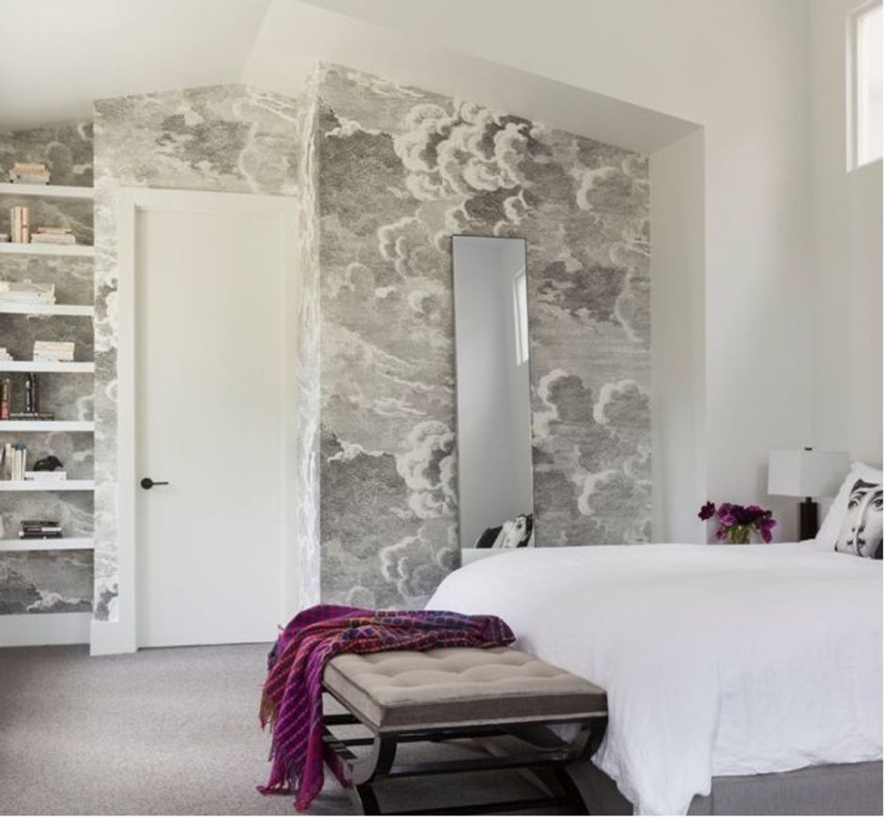 The master bedroom turns away from some of the details Lowengart used throughout the rest of the house. It features no dark or colorful accents and instead has a serene, muted palette. Lowengart covered one wall with wallpaper, but instead of introducing a bold or colorful pattern, she reinforced tranquility. With the rest of the house designed for family and entertaining, the bedroom is a refuge for the couple. The couple's two kids share a bedroom that has as much of a casual modern vibe as the rest of the house.