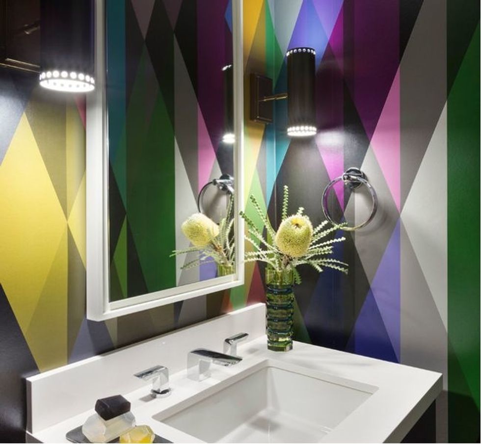 Lowengart played again with wallpaper in the downstairs powder room, covering all four walls in a bright geometric pattern. "Wallpaper has come back big," she says, and in general she is particularly daring in bathrooms. "When you use a big pattern in a large room, it can be overwhelming," she says, but bathrooms and other smaller rooms can benefit from wallpaper's drama. "It's a great way to inject color, whimsy and pattern," she says, especially since bathrooms are mostly about utility and essentials.