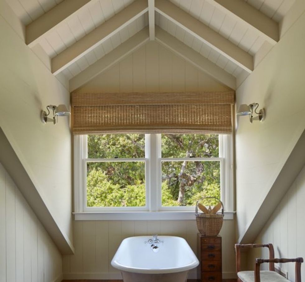 That character is expressed in the master bath, where a dormer surrounds a traditional claw-foot tub. The bathtub is angled to take in the leafy vista.
