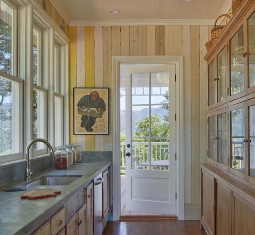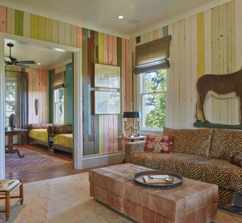 "When we bought the house, the rooms were painted these crazy colors, but we never repainted them," says the owner. "During the remodel, because we were installing new wiring and plumbing, the contractors had to remove all the boards. They were stacked in the yard, and I was very inspired by them and the mixing of the colors. The idea was that they would be reinstalled and repainted, but when I saw the boards go up at random, I thought, 'Oh, my God! I love these!' I decided I wasn't going to do it." She let the contractors continue to install them in the totally random pattern that's on display today (seen here in the media room).
