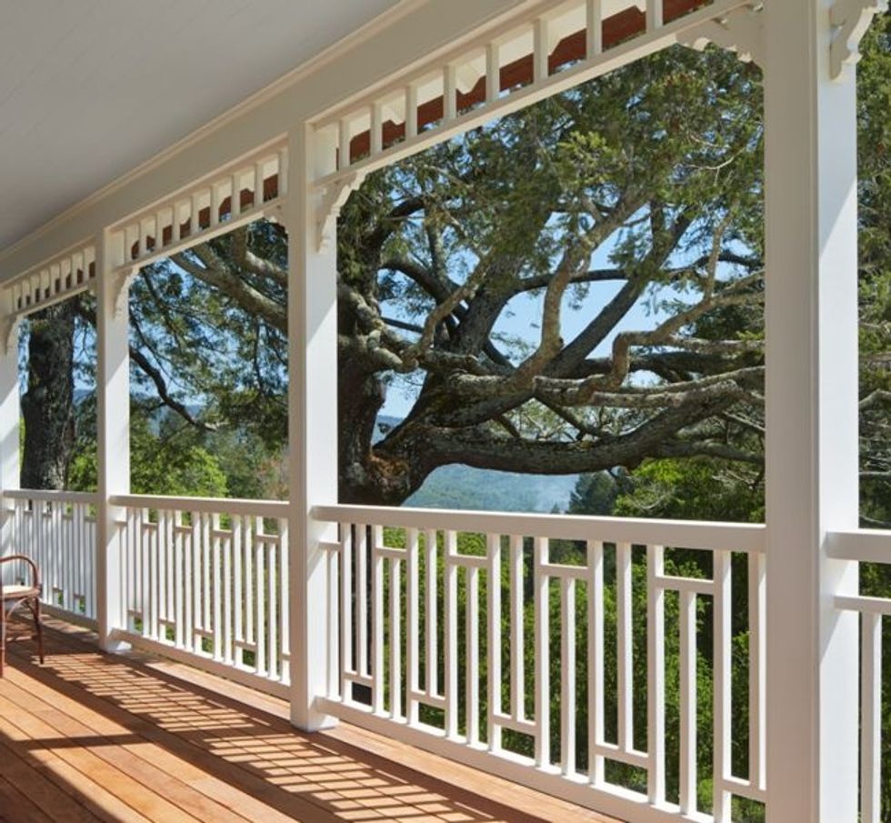 The reworked porch railing is an elaborate frame for the old oak trees that surround the site. The trees spoke to the owners when they bought the property 20 years ago, as they reminded them of New Orleans.