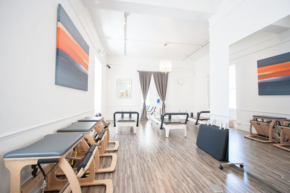 On my first day of reformer class, I checked in at the third-floor reception, where there's also a small changing room, a bathroom stocked with amenities for freshening up, some lockers, and a large mirrored room for group classes. My class was held downstairs, beneath the sparkly chandelier of the apparatus room and set to soft hip-hop tunes. I laid down on the machine closest to the window (which looks straight into neighboring Joseph Cozza Salon), and quickly learned the foundation for all my future Pilates work: the neutral spine. Trust me, this is harder than it sounds.