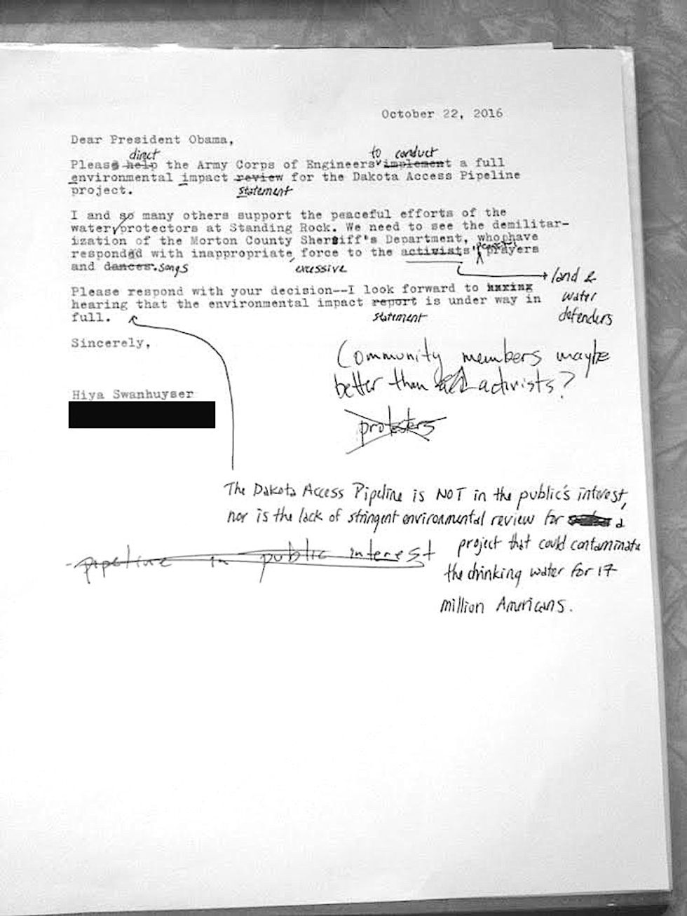 ...Write to your direct representatives. I have a lot of things I want to say to the Morton County Sheriff's Department right now, but they're not obligated to listen to non-constituents.