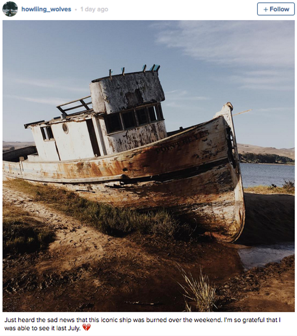 In another case of "why we can't have nice things," the iconic shipwrecked fishing boat in Point Reyes— we're sure you recognize it from Instagram—was severely damaged by a fire on Tuesday morning, likely due to the shot of an unidentified amateur photographer.