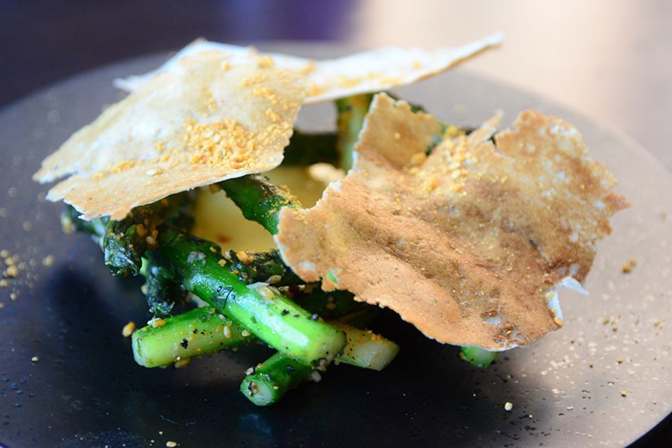 With awakened palates and receptive minds, we set into the food, starting with a trio of chutneys—an insistently sweet-hot chili-and-peanut; a fire-suppressing avocado-and-yogurt; and a richly fruity tomatillo-and-green-mango—served with wonderfully fresh naan, some of it stuffed with a yummy, gooey, spicy green pea and goat cheese kulcha. Then asparagus pepper fry, a pleasingly three-dimensional dish with a base of delicately spiced curried cauliflower and potato mousse, perfectly al dente asparagus spears seasoned with podi masala, and topped with crispified dosa, the savory South Indian pancake made from rice and lentils.